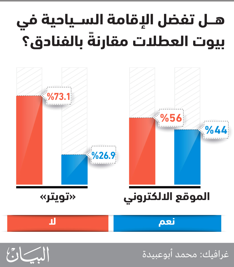 وطرح الاستطلاع سؤالاً مفاده: «هل تفضل الإقامة السياحية في بيوت العطلات مقارنة بالفنادق؟»، وأجاب 44% من المشاركين في الاستطلاع على موقع «البيان الإلكتروني» بـ «نعم»، مؤكدين تفضيلهم للإقامة في بيوت العطلات، لكن النسبة الأكبر 56% أجابوا بـ «لا» لتبقى الفنادق وجهة الإقامة المفضلة لهم. فيما انخفضت نسبة المشاركين في الاستطلاع على تويتر الذين اختاروا بيوت العطلات للإقامة السياحية إلى 26.9%، حيث أجابوا بـ «نعم» فيما أجاب 73.1% بـ «لا».