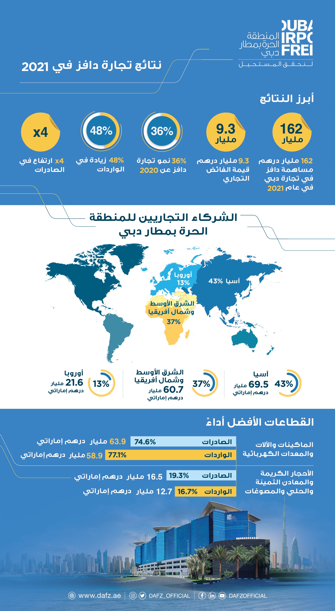 شهدت "دافز" خلال العام 2021 تحقيق نمو متميز أسهم في تسجيل فوائض عبر مختلف قطاعات الأعمال بشكلٍ عام، وقطاعي الماكينات والآلات والمعدات الكهربائية ومجموعة الأحجار الكريمة والمعادن الثمينة والحلي والمصوغات بشكلٍ خاص، واللتين شهدتا نمواً بين 36% و46% مشكلتين نحو 94% من إجمالي تجارة "دافز".