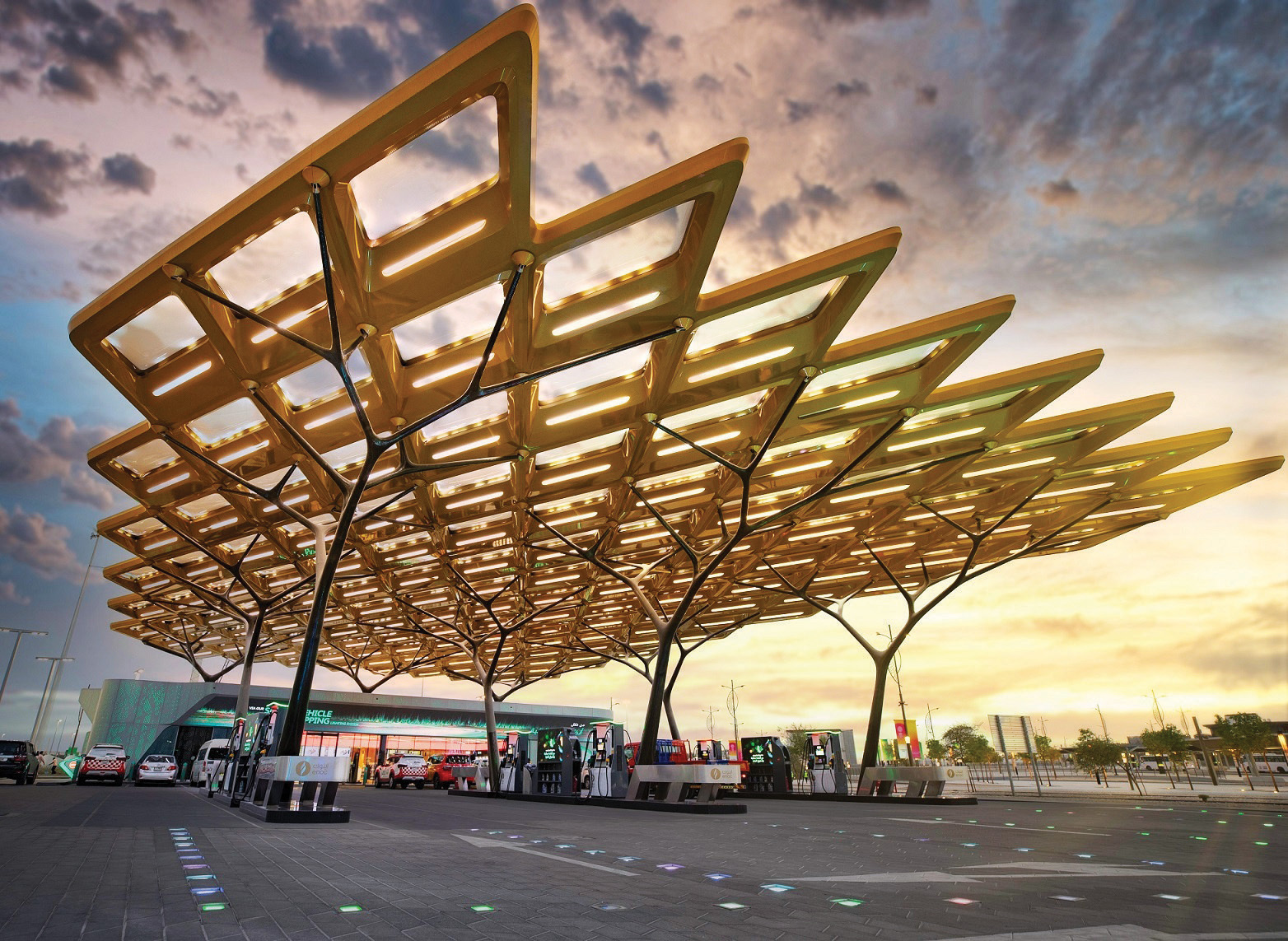 واستوحت محطة الخدمة تصميمها من التراث الغني لدولة الإمارات متمثّلاً في شكل شجرة الغاف التي تجسد رمزاً وطنياً، وشُيّد هيكل المحطة باستخدام 43,000 متر مربع من ألياف الكربون (تعادل 37 طناً). وصُمم الهيكل باستخدام 133 إطاراً على شكل أوراق شجرة الغاف، وتتوسطها مادة إيثيلين رباعي فلورو الإيثيلين المبتكرة والمقاومة للتآكل، وجرت إضاءتها بأكثر من 3,800 ضوء بتقنية الإنارة بالصمامات الثنائية الباعثة للضوء LED.