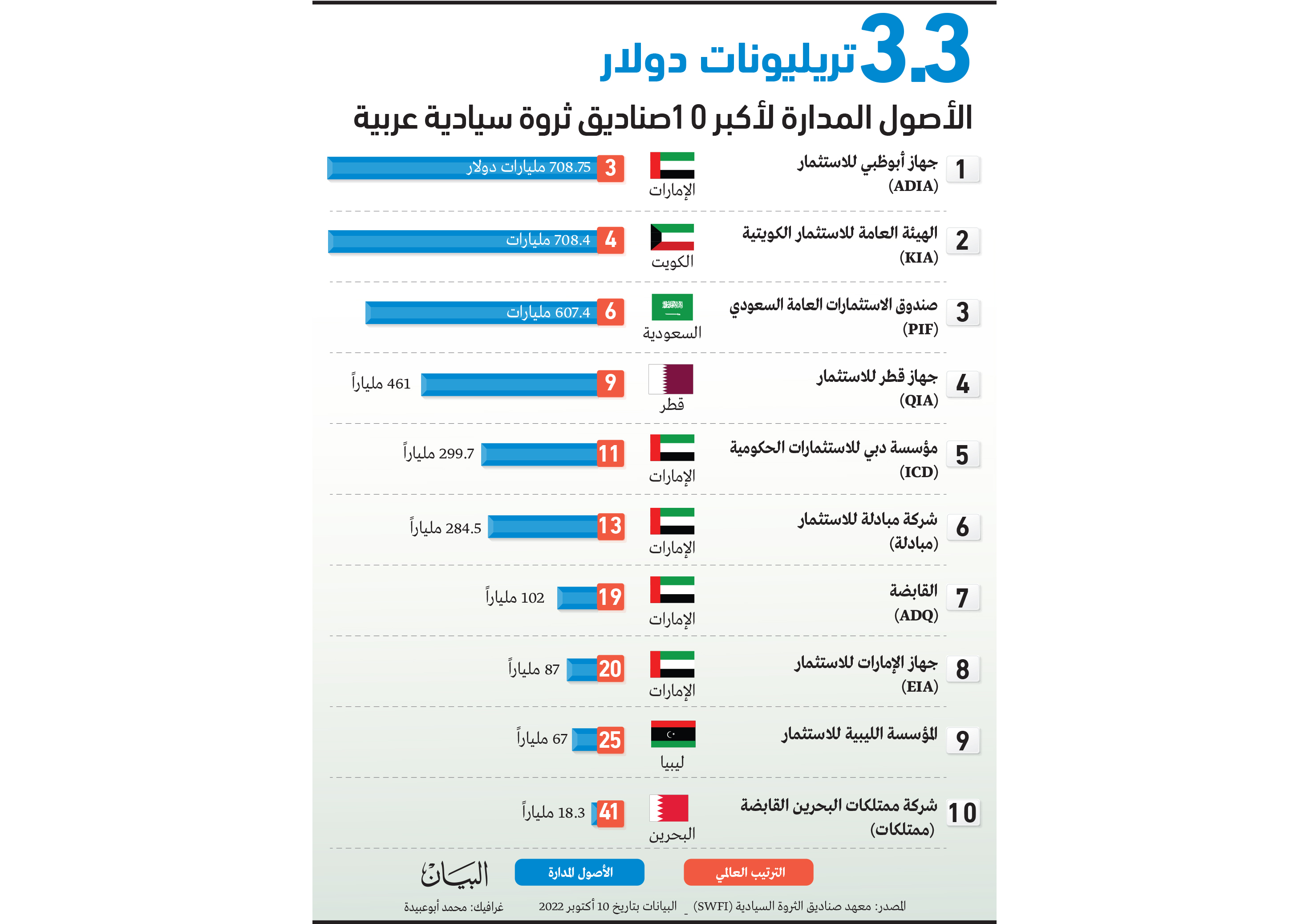 وفيما يلي أكبر 10 صناديق ثروة سيادية عربية: