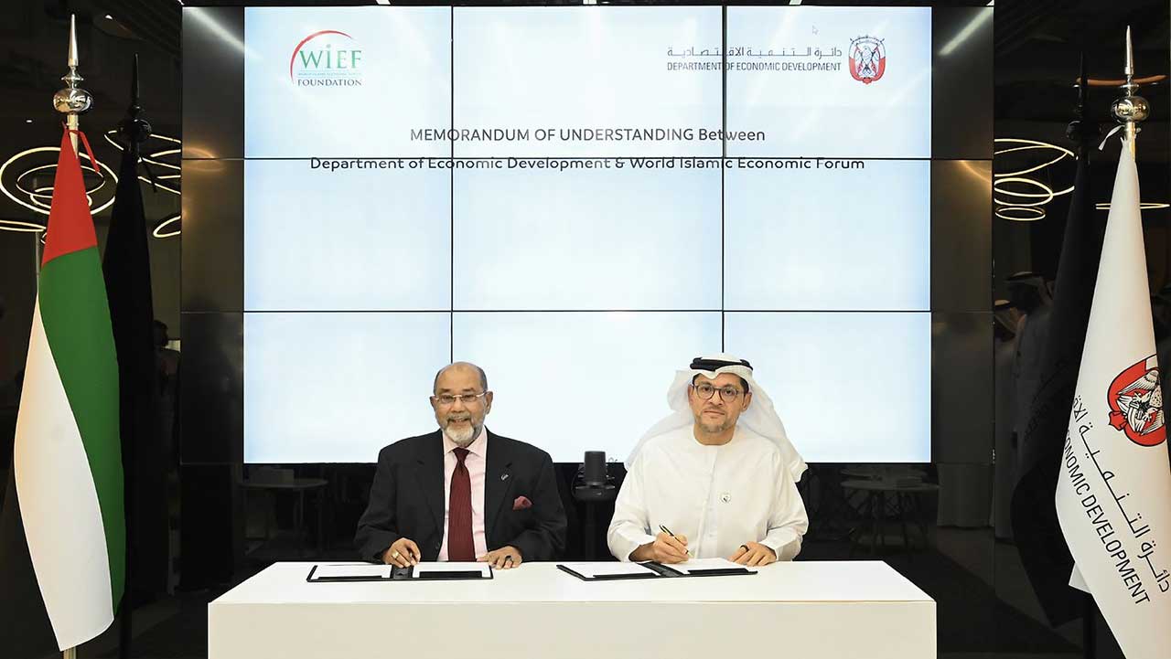 ووقع معالي محمد علي محمد الشرفاء الحمادي رئيس دائرة التنمية الاقتصادية - أبوظبي، ومعالي الدكتور سيد حامد سيد جعفر البر، رئيس مؤسسة المنتدى الاقتصادي الإسلامي العالمي اتفاقية استضافة الدورة الـ14 للمنتدى.