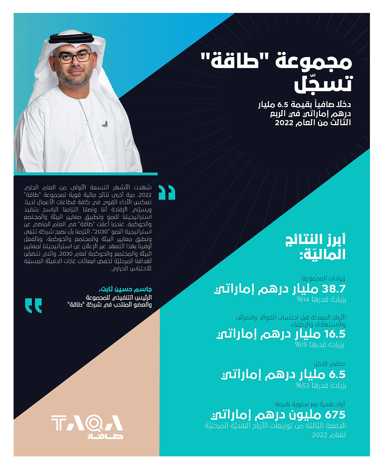وقال جاسم حسين ثابت، الرئيس التنفيذي للمجموعة والعضو المنتدب في «طاقة»: شهدت الأشهر التسعة الأولى من 2022، مرة أخرى نتائج مالية قوية لمجموعة «طاقة». كما واصلنا التزامنا الراسخ بتنفيذ استراتيجيتنا للنمو وتطبيق معايير البيئة والمجتمع والحوكمة. عندما أعلنت «طاقة» في العام الماضي عن استراتيجية النمو «2030»، التزمنا بأن نصبح شركة تتبنى وتطبق معايير البيئة والمجتمع والحوكمة، وبالفعل أوفينا بهذا التعهد عبر الإعلان عن استراتيجيتنا لمعايير البيئة والمجتمع والحوكمة لعام 2030.