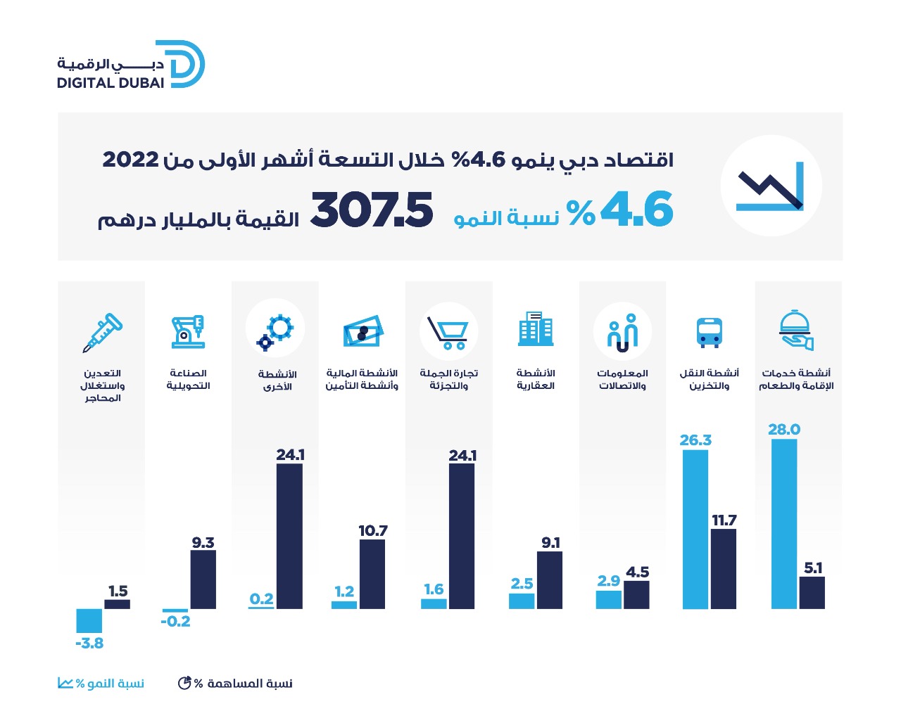 أعلن سمو الشيخ حمدان بن محمد بن راشد آل مكتوم، ولي عهد دبي رئيس المجلس التنفيذي لإمارة دبي تحقيق اقتصاد الإمارة نمواً بنسبة 4.6% خلال التسعة أشهر الأولى من عام 2022، مقارنة بالفترة ذاتها من العام السابق، وبقيمة إجمالية قدرها 307.5 مليارات درهم وفقاً للبيانات الصادرة عن مركز دبي للإحصاء بهيئة دبي الرقمية.