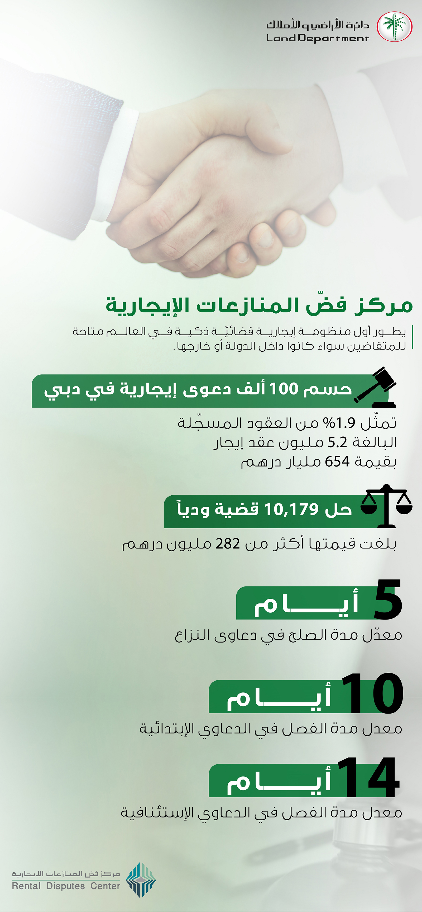 تسع سنوات حافلة بالإنجاز والعطاء والتنمية المستدامة هي مسيرة مركز فض المنازعات الإيجارية الذراع القضائي لدائرة الأراضي والأملاك في دبي الذي انطلق وفقاً لرحلة منهجية تطويرية بهدف تحقيق الاستقرار الاجتماعي والاقتصادي لكافة المعنيين بقطاع تأجير العقارات والقطاعات المرتبطة بها وتطوير آليات إجراءات البت في المنازعات وترسيخ منظومة قضائيّة متخصّصة في النظر فيها وفقاً لآلية مبسطة وسريعة.