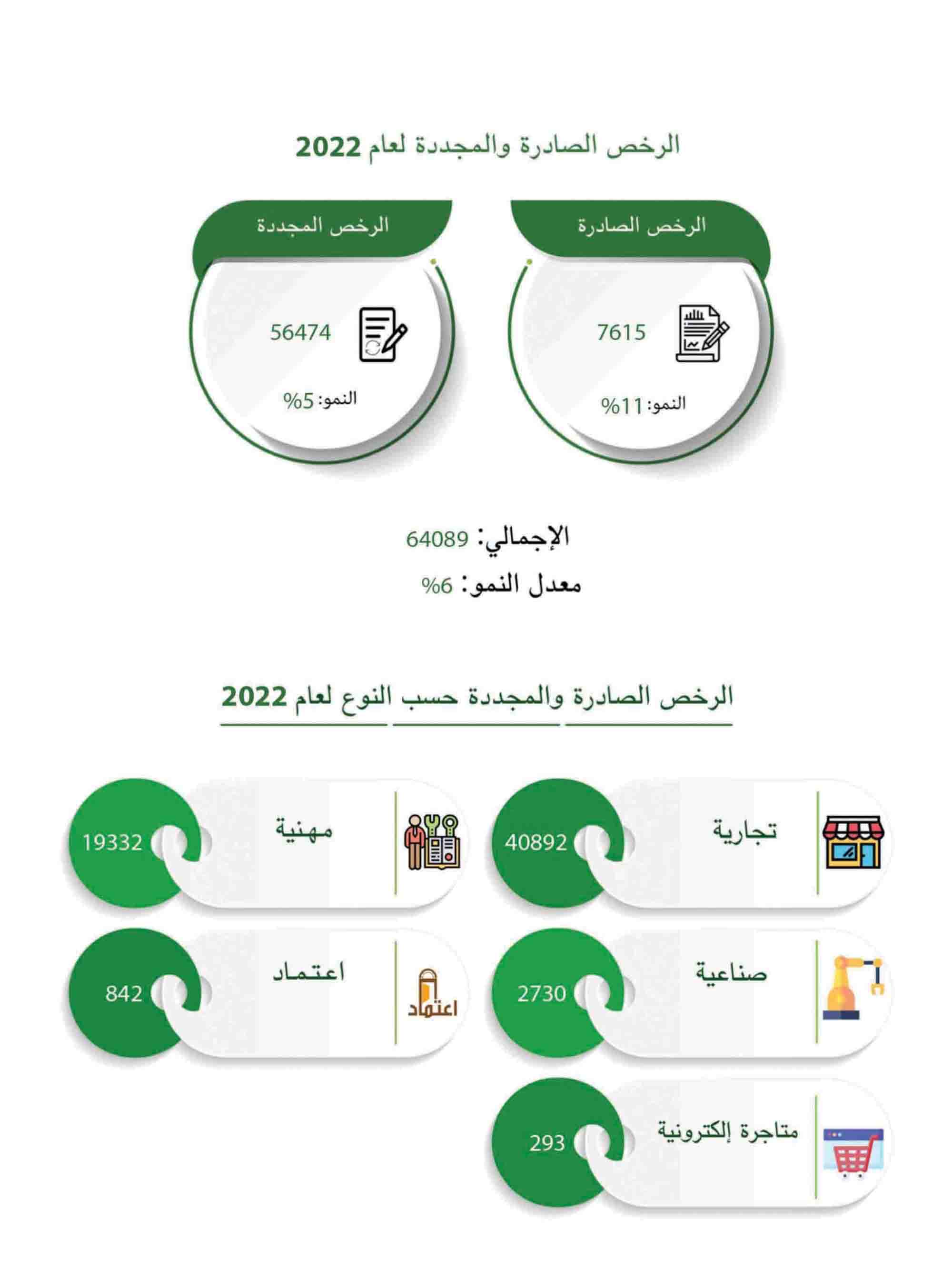 وفي ما يتعلق بالرخص المجددة خلال عام 2022، فقد بلغ إجمالي الرخص التجارية المجددة 36416 رخصة، بنمو 4 %، وبلغ إجمالي الرخص المهنية المجددة 16910 رخص، بنمو 5 %، فيما بلغ عدد الرخص الصناعية المجددة 2401 رخصة، بنسبة نمو بلغت 7 %، ورخص اعتماد بإجمالي 628 رخصة مجددة، بنمو 10 %، فيما نمت رخص المتاجرة الإلكترونية 78 %، بإجمالي 119 رخصة مجددة.