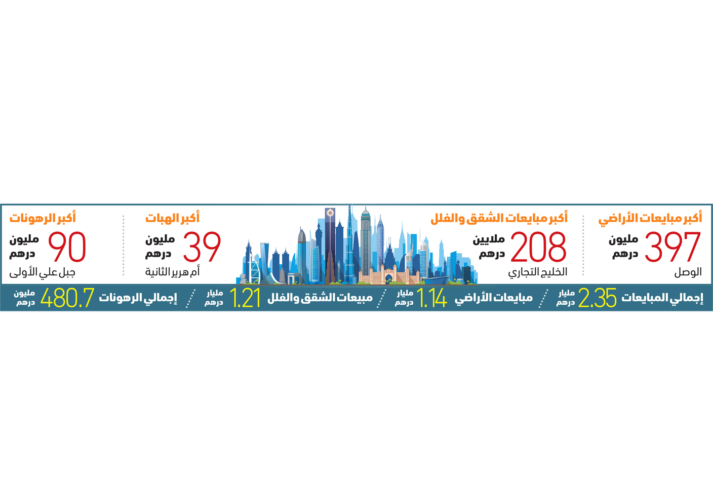 وسجلت الرهونات 480.69 مليون درهم منها 26 رهونات أراض بقيمة 107.97 ملايين درهم و99 رهونات فلل وشقق بقيمة 372.72 مليون درهم أهمها بمجمع دبي للاستثمار الأول بقيمة 90 مليون درهم وتم تسجيل 91 هبة بقيمة 171.85 مليون درهم أهمها في أم هرير الثانية بقيمة 39 مليون درهم.