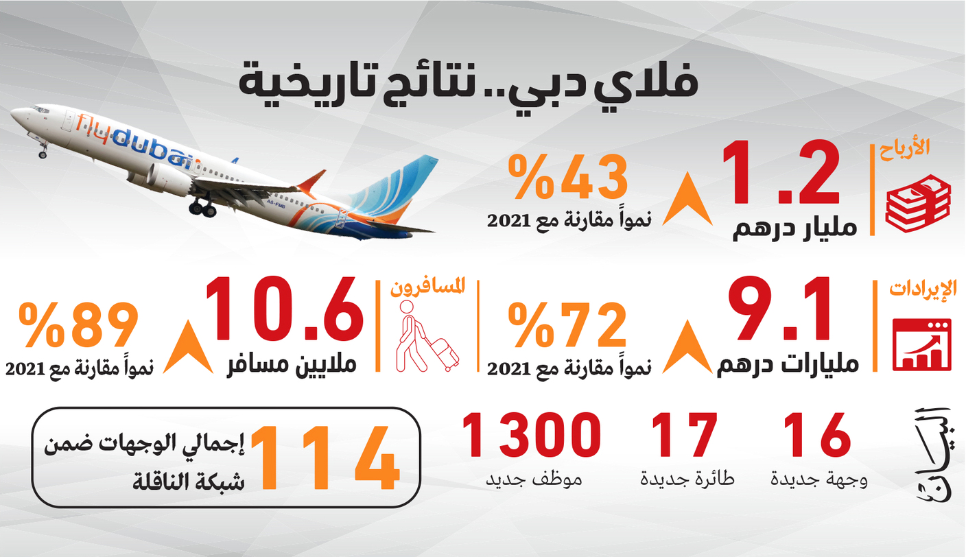 حققت شركة «فلاي دبي» أرباحاً تاريخية بلغت 1.2 مليار درهم بنمو 43% في عام 2022، بسبب زيادة حركة السفر الجوي وازدهار السفر في الإمارات، ولتعكس الأنموذج القوي للأعمال القائم على كفاءة التشغيل والمرونة، بينما بلغت الإيرادات السنوية للعام الماضي 9.1 مليارات درهم مقارنة مع 5.3 مليارات درهم في عام 2021؛ بنمو بلغ 72%، وتسلمت فلاي دبي 17 طائرة جديدة وهو أعلى عدد من الطائرات تتسلمه في عام واحد، وبلغ عدد المسافرين الذين نقلتهم 10.6 ملايين مسافر بنمو 89% مقارنة بعام 2021. بينما بلغ عدد الموظفين الجدد الملتحقين بالناقلة 1,300 موظف في أكبر عملية توظيف في الشركة خلال عام واحد.