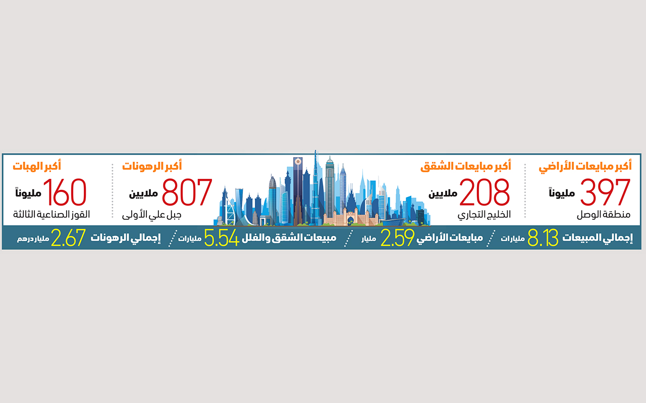 وجاءت أهم مبايعات الأراضي بقيمة 397 مليون درهم في الوصل تليها مبايعة بقيمة 168 مليون درهم في الخليج التجاري تليها مبايعة بـ 168 مليون درهم في الخليج التجاري.