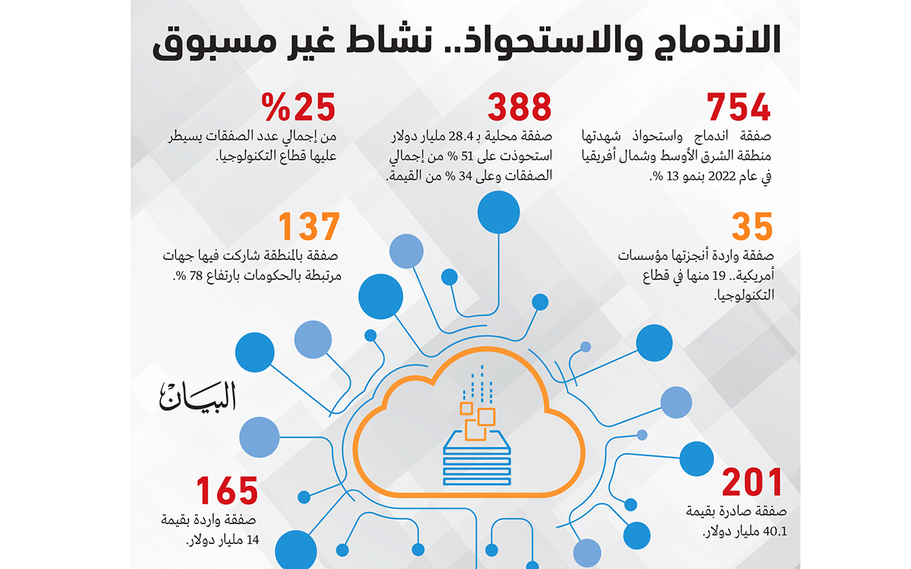 كشف تقرير «إرنست ويونغ» (EY) لصفقات الاندماج والاستحواذ في منطقة الشرق الأوسط وشمال أفريقيا عن نشاط غير مسبوق خلال عام 2022، مع تسجيل 754 صفقة خلال العام، متجاوزة الأرقام التقليدية التي كانت تسجلها تاريخياً بين 500 إلى 600 صفقة، لتحقق نمواً في عدد الصفقات بنسبة 13 % مقارنة مع عام 2021. وحافظت الإمارات على تصدرها لقائمتي البلدان الأكثر جذباً والأكثر تنفيذاً للصفقات في منطقة الشرق الأوسط وشمال أفريقيا، تلتها المملكة العربية السعودية في كلتا القائمتين. واحتلت كلٌّ من مصر وسلطنة عُمان مكاناً على قائمة الدول الخمس الأكثر جذباً وتنفيذاً لصفقات الدمج والاستحواذ.