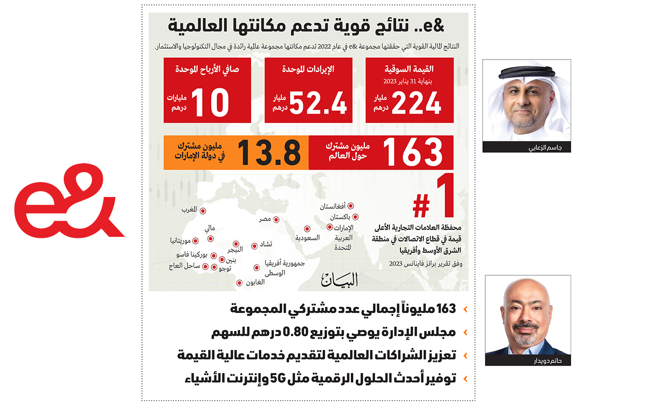 وقال جاسم الزعابي، رئيس مجلس إدارة &e: تعد النتائج المالية الاستثنائية التي حققتها &e، دليلًا قويًا على نجاح استراتيجيتنا في التحول إلى مجموعة تكنولوجية واستثمارية، تسعى للمساهمة بشكل قوي في تطوير الأجيال القادمة من الاتصالات ووضع بصمة حقيقية في ابتكار الحلول التكنولوجية المتطورة. وأضاف: تحرص المجموعة منذ بدء رحلتها للتحول إلى مجموعة تكنولوجية، على تنويع أعمالها ومصادر الدخل لديها عبر محاور الأعمال المتكاملة التي أسستها، وذلك من خلال التوسع إلى قطاعات جديدة وتقديم خدمات تكنولوجية مبتكرة، والتركيز على الاستفادة من الإمكانات التي توفرها التكنولوجيا الرقمية لتقديم أحدث الحلول والخدمات للعملاء في مختلف الأسواق التي تعمل بها. وتابع: يظل التزامنا بخدمة عملائنا وإضافة القيمة المستدامة للمساهمين في صلب أولوياتنا، وأساس أعمالنا كمجموعة تكنولوجية رائدة عالميًا، ونسعى دائمًا من أجل إحداث تأثير إيجابي في المجتمعات التي نخدمها، مدعومين بنتائجنا المتميزة خلال عام 2022 التي أحرزناها بفضل العمل الجاد والمتفاني لفريق الإدارة والموظفين، الذين قاموا ببذل جهود مضاعفة لترسيخ المكانة الإقليمية والعالمية للمجموعة، كواحدة من أكثر العلامات التجارية موثوقية وتأثيرًا في القطاعات الحيوية. واختتم بالقول: أتوجه بالشكر والامتنان للقيادة الرشيدة للإمارات على رؤيتها الملهمة لنا خلال رحلتنا المتواصلة في الانتقال من نجاح إلى آخر، وتحقيق تحول رقمي أكثر شمولًا، وقيادة قدرات جديدة في مجال تكنولوجيا المعلومات والاتصالات، مما يمكننا من المساهمة في بناء مستقبل رقمي يعمل على تمكين ودعم المجتمعات ويعزز من رفاهيتها.