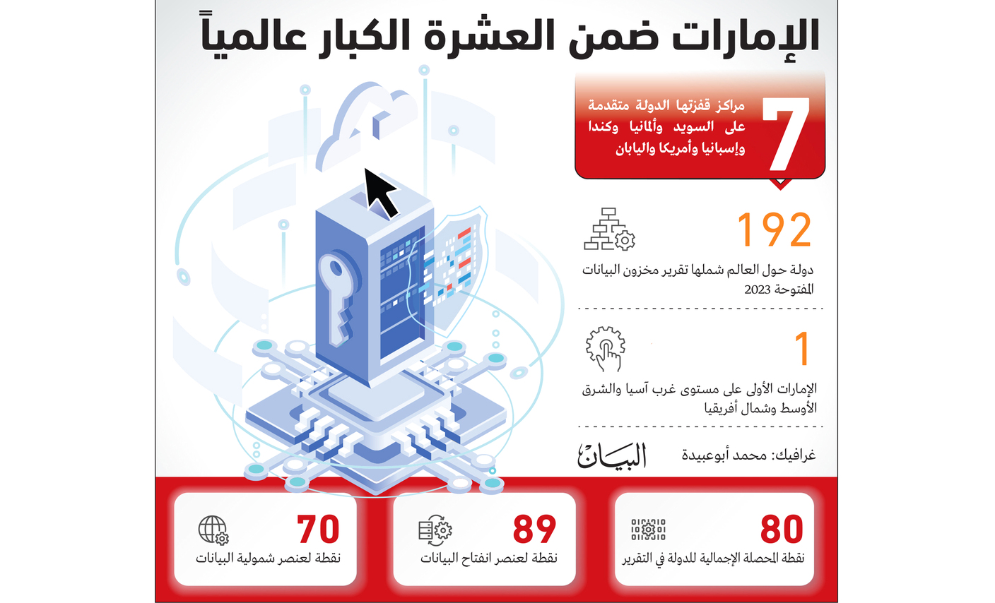 وأضافت الهاشمي: «يُمثِّل تقرير «مخزون البيانات المفتوحة (ODIN) للعام 2022 الإصدار السادس من سلسة التقارير التي تعدها منظمة البيانات المفتوحة كلّ عامين، وهو واحد من أهم التقارير التنافسية في مجال البيانات المفتوحة، حيث حققت دولة الإمارات 89 نقطة لعنصر انفتاح البيانات، و70 نقطة لعنصر شمولية البيانات، وجاءت المحصلة الإجمالية للدولة في التقرير 80 نقطة لتقفز بجدارة 7 مراكز بالمقارنة مع النسخة الماضية من التقرير».