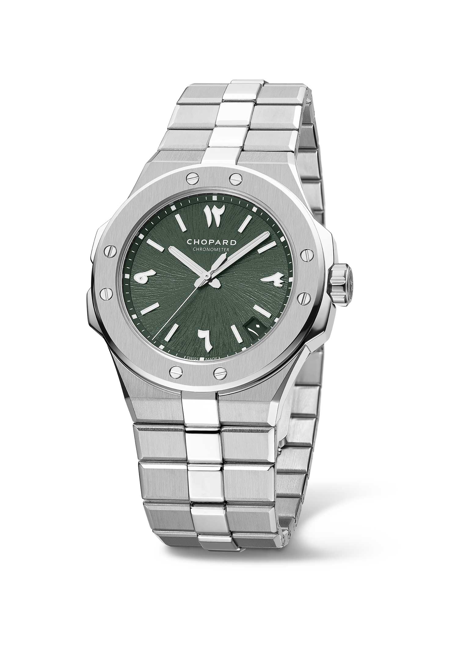 انضم إلى مجموعة (Alpine Eagle) للساعات الرياضية الأنيقة موديل حصري جديد بقطر 41 ملم يتميز بمينا بديع باللون الأخضر الصنوبري (Pine Green) تبرز عليه أرقام الأوردو لمشيرات الساعات. صنع هذا الموديل من معدن لوسنت ستيل 223A الذي أصبح علامة شوبارد المميزة للمتانة العالية والبريق المتقد، ويضبط إيقاع حركته عيار (Chopard 01.01-C) الذي وثّقت دقته وصودق عليها بشهادة "الكرونومتر".