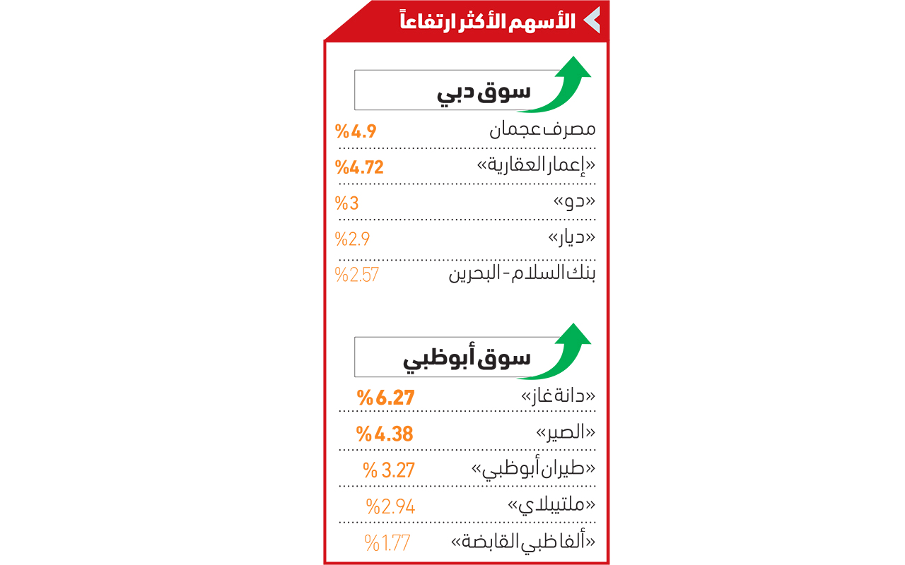 وفي سوق أبوظبي ارتفعت أسهم «دانة غاز» 6.27 %، و«الصير» 4.38 %، وطيران أبوظبي 3.27 %، و«ملتيبلاي» 2.94%، و«ألفا ظبي القابضة» 1.77 %.