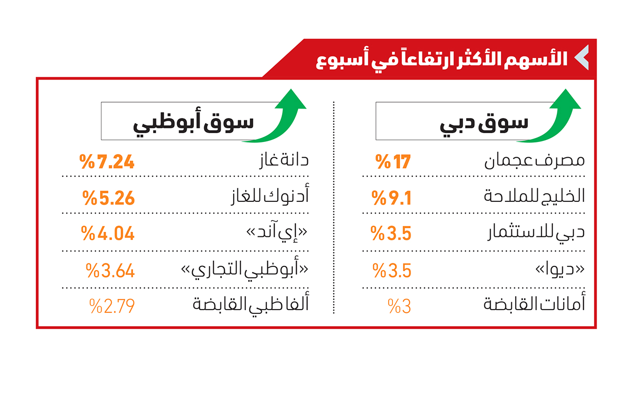 وفي أبوظبي، صعدت أسهم دانة غاز 7.24 %، وأدنوك للغاز 5.26 %، و«إي آند» 4.04 %، وارتفع «أبوظبي التجاري» 3.64 %. وخلال الأسبوع الماضي، تقدم سوق أبوظبي البورصات العربية مع ارتفاع قيمته السوقية بنحو 4.87 مليارات دولار من 735.7 مليار دولار إلى 740.5 مليار دولار، بحسب صندوق النقد العربي فيما وصل رأس المال السوقي لسوق دبي المالي عند 159.3 مليار دولار. وعلى المستوى اليومي، أغلق مؤشر فوتسي سوق أبوظبي العام «فادجي»، الجمعة، عند مستوى 9502.51 نقطة، منخفضاً 0.49 %، فيما أقفل مؤشر سوق دبي بتراجع 0.42 % إلى 3349.48 نقطة. واجتذبت الأسهم المحلية سيولة بنحو 1.24 مليار درهم موزعة بواقع 1.05 مليار درهم في سوق أبوظبي و196.45 مليون درهم في سوق دبي.