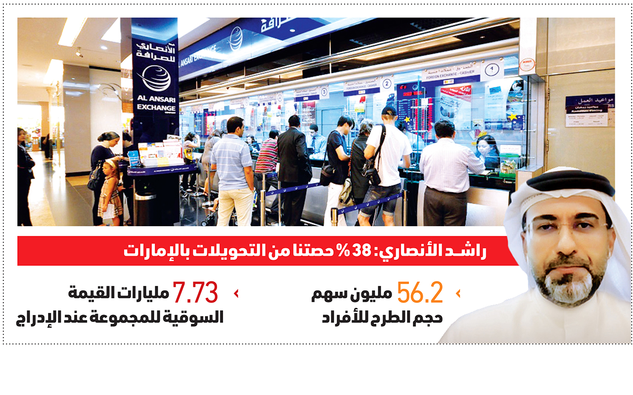 وسيتم تحديد سعر الطرح النهائي من خلال عملية بناء سجل الأوامر، ومن المتوقع الإعلان عنه في 27 مارس الجاري. ومن المتوقع إدراج الأسهم في سوق دبي المالي يوم 6 أبريل المقبل. وأشار الأنصاري إلى أن حصة الشركة من سوق التحويلات بالإمارات بلغت 38 % ومن التحويلات الفردية على المستوى العالمي نحو 2.6 %، مؤكداً أن الهدف الأساسي من التوسع هو الوصول إلى أكبر عدد ممكن من العملاء في الإمارات عبر الفروع رغم نمو المعاملات الإلكترونية. وانتهى يوم الجمعة الماضي الاكتتاب في مجموعة «الأنصاري للخدمات المالية» للمستثمرين المحترفين، وسبقه يوم الخميس الماضي إغلاق باب الاكتتاب أمام المستثمرين الأفراد في الإمارات.