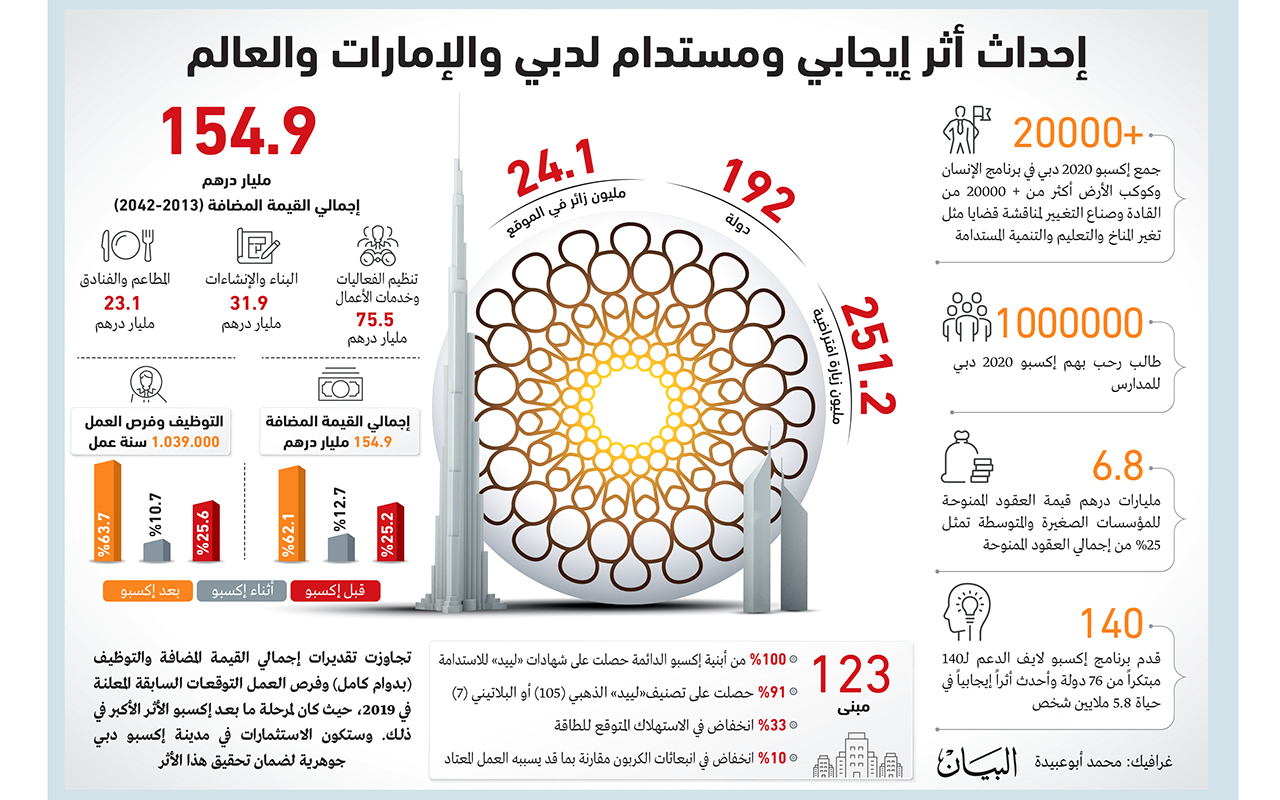 توقع تقرير لشركة «إرنست ويونغ» (EY) أن يبلغ إجمالي القيمة التي يضيفها إكسبو 2020 دبي وإرثه لاقتصاد دولة الإمارات حوالي 154.9 مليار درهم (42.2 مليار دولار)، في الفترة من 2013 (تاريخ الفوز بتنظيم إكسبو) إلى 2042. كما توقع أن يدعم توفير فرص عمل تقدر بما يقرب من 1.039.000 سنة عمل بدوام كامل، أي ما يعادل أكثر من 35.600 وظيفة بدوام كامل سنوياً في دولة الإمارات خلال ذات الفترة.