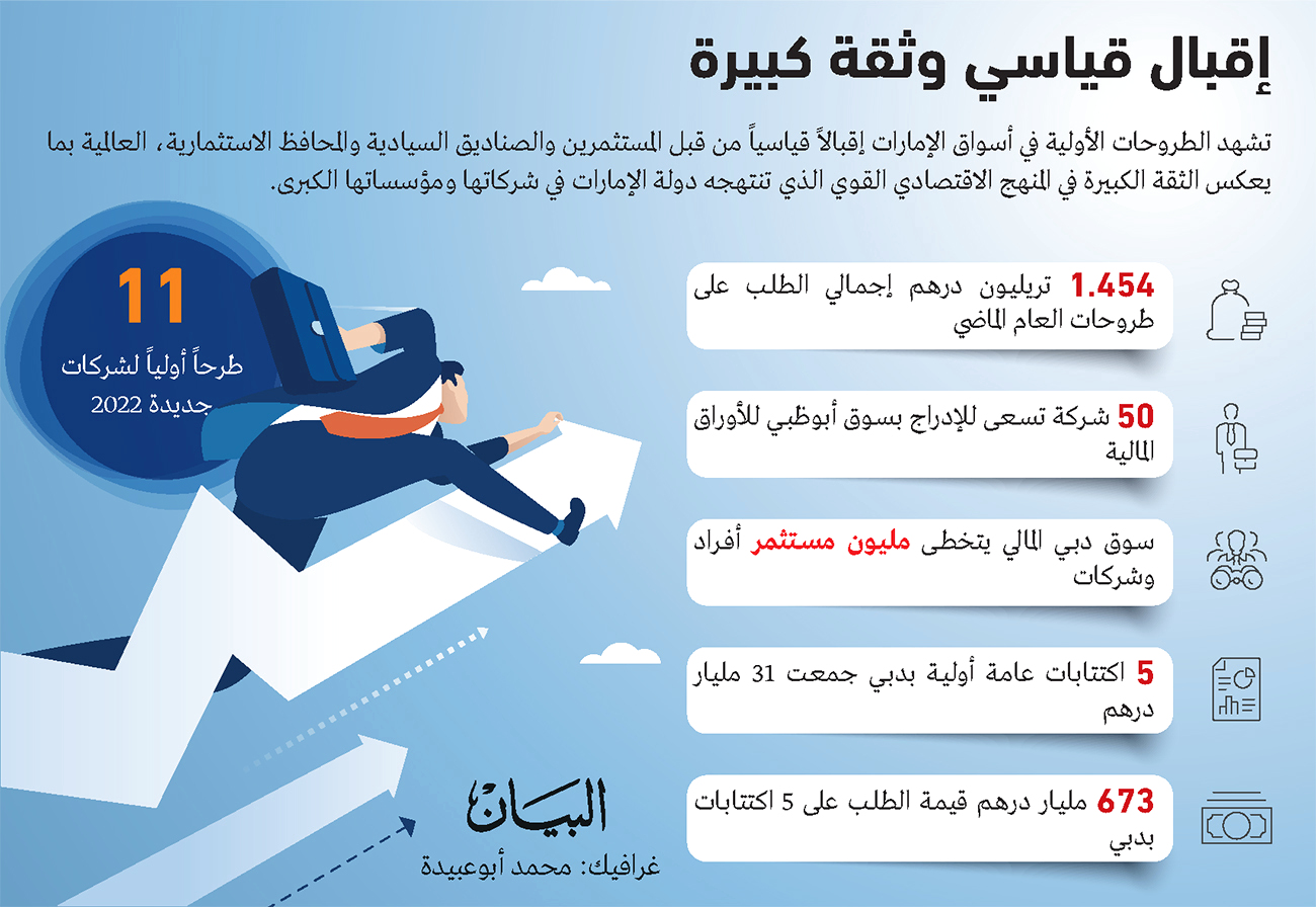 وشهدت أسواق المال المحلية 11 طرحاً أولياً لشركات جديدة خلال عام 2022، وجمعت هذه الطروحات ما يناهز 51.2 مليار درهم، ووصل إجمالي الطلب على هذه الطروحات إلى أكثر من 1.454 تريليون درهم.