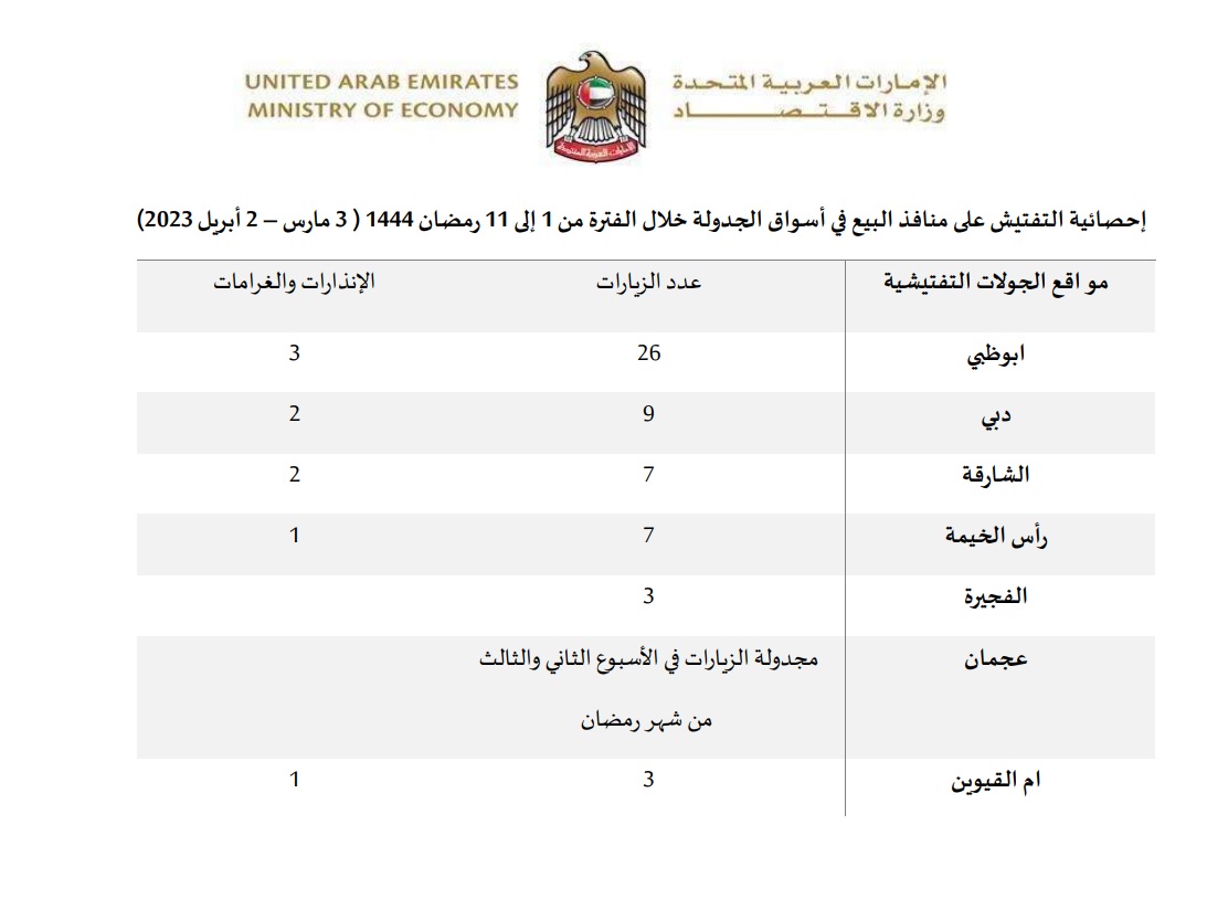 نفذت فرق التفتيش التابعة لوزارة الاقتصاد زيارات ميدانية على الأسواق بالتعاون مع دوائر التنمية الاقتصادية بالدولة، أسفرت عن مخالفة وإنذار 9 منافذ لبيع للسلع والمنتجات الغذائية، وذلك خلال الأيام الـ 11 الأولى من شهر رمضان المبارك.