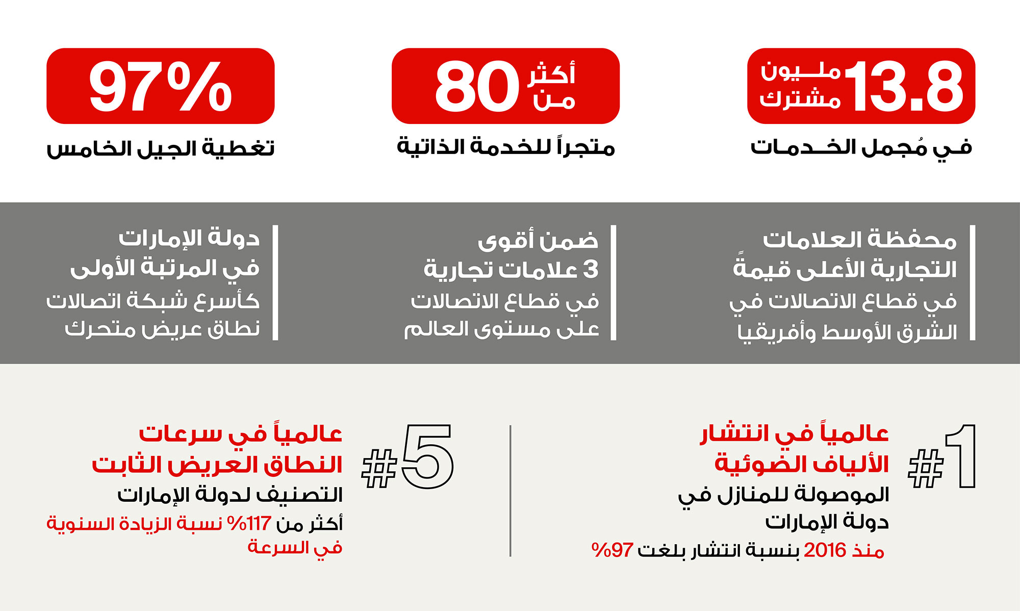 ●تجاوزنا 13.8 مليون مشترك في خدماتنا في دولة الإمارات بفضل توسعاتنا واستثماراتنا في الشبكات وإطلاق خدمات مبتكرة تقدِّم قيمة لا مثيل لها، من خلال مزيج فريد من مزايا الاتصالات والخدمات الرقمية والحلول الذكية.