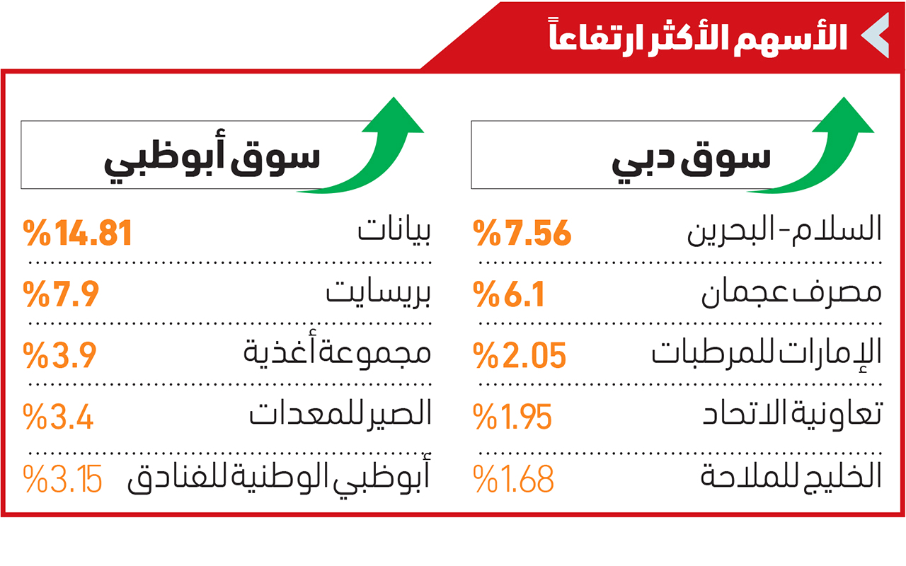 واجتذبت الأسهم المحلية في ختام جلسة أمس سيولة بنحو 1.4 مليار درهم موزعة بواقع 1.12 مليار درهم في سوق أبوظبي و277.63 مليون درهم في سوق دبي. وجرى التداول على نحو 1.49 مليار سهم عبر تنفيذ 78.25 ألف صفقة، بعد تداول 460.5 مليون سهم عبر تنفيذ أكثر من 18.5 ألف صفقة.