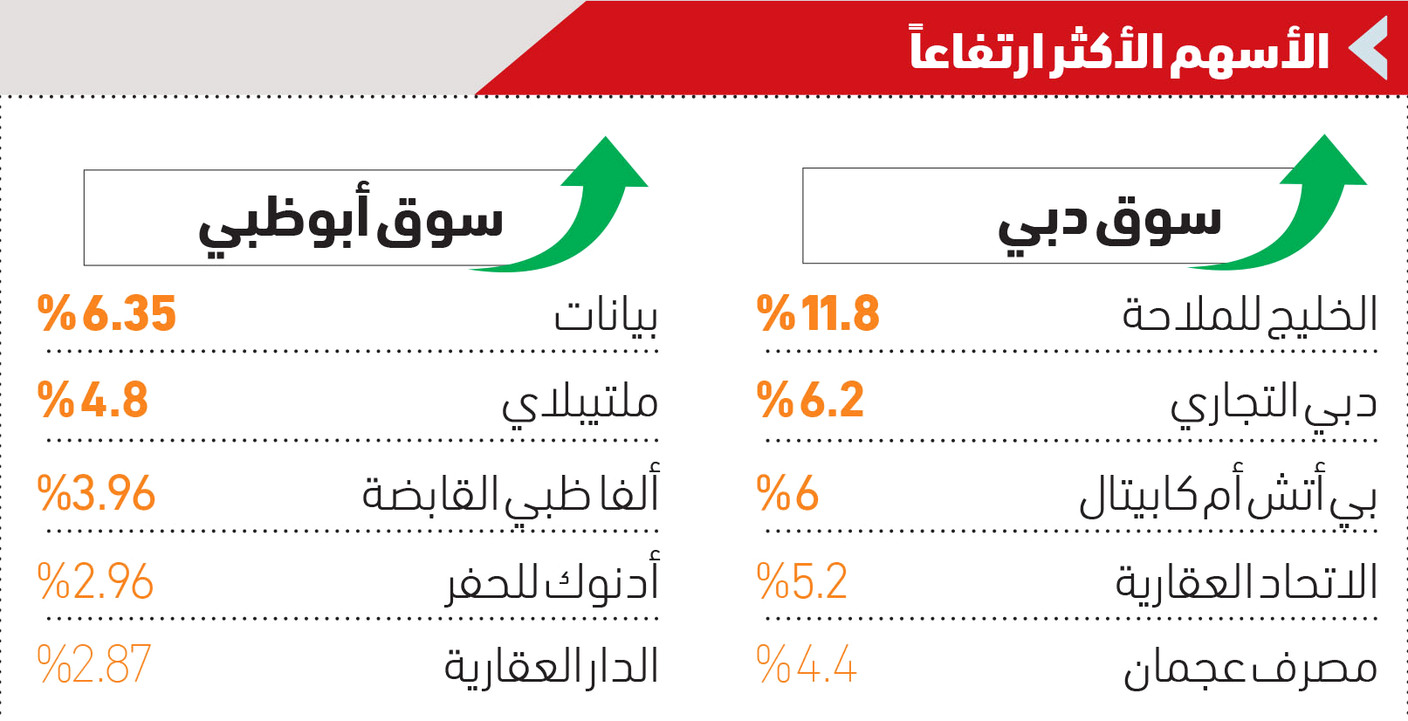 وارتفع في سوق أبوظبي أسهم بيانات 6.35 %، وملتيبلاي 4.8 %، وألفا ظبي القابضة 3.96 %، أدنوك للحفر 2.96 %، الدار العقارية 2.87 %، وبروج 1.53 %، وبريسايت 1.2 %، وأمريكانا للمطاعم 1.02 %.