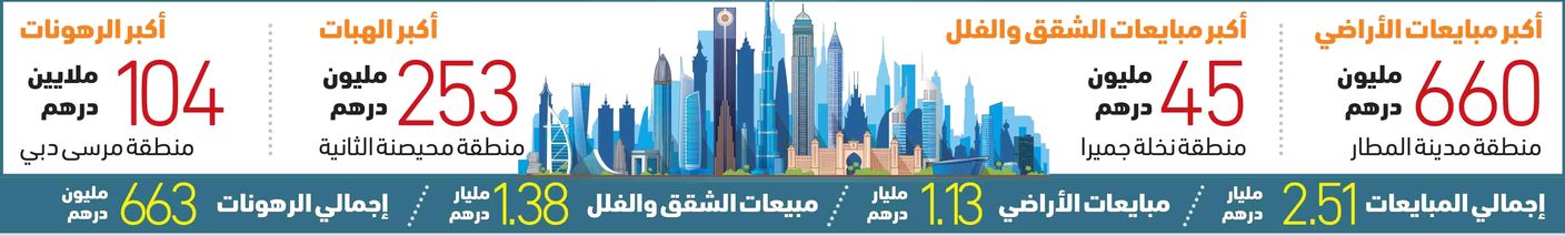 بلغت التصرفات العقارية في دائرة الأراضي والأملاك بدبي 3.4 مليارات درهم، حيث شهدت الدائرة أمس تسجيل 612 مبايعة بـ2.51 مليار درهم، منها 60 مبايعة للأراضي بـ1.13 مليار، و552 مبايعة للشقق والفلل بـ1.38 مليار درهم، وجاءت أهم مبايعات الأراضي بـ660 مليون درهم في منطقة مدينة المطار، أما في ما يتعلق بأهم مبايعات الشقق والفلل، فجاءت مبايعة بقيمة 45 مليون درهم بمنطقة نخلة جميرا كأهم المبايعات.