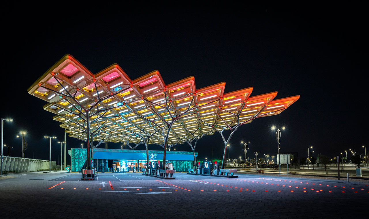 تجدر الإشارة إلى أنه في عام 2021، افتتحت اينوك محطة الخدمة المستقبلية الحائزة على الجوائز والتي تستلهم تصميمها من التراث الغني لدولة الإمارات متمثلاً في شكل شجرة الغاف، وترسي معياراً في الابتكار في محطات الوقود. كما تعد أول محطة خدمة في العالم تحصل على التصنيف البلاتيني للريادة في تصميمات الطاقة والبيئة (LEED)، عدا عن كونها أول محطة في المنطقة تدمج ألياف الكربون في هيكل مظلتها وتوربينات الرياح المرتبطة بالشبكة لتوليد الطاقة.