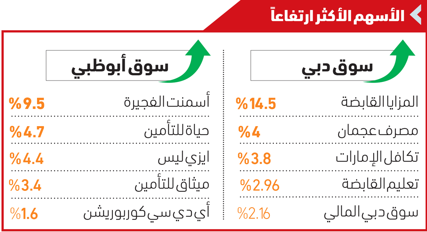 وأغلق مؤشر سوق دبي عند مستوى 3525.81 نقطة، متراجعاً بنسبة 0.12 %، وقاد سهما «مصرف عجمان» و«تعليم» مكاسب 19 شركة بسوق دبي، وارتفعا بنسبتي 4 % و2.96 % على التوالي، وقفز سهم «المزايا القابضة» بنسبة 14.5 % بالحد الأقصى. وشهد سوق دبي ارتفاع أسهم تكافل الإمارات 3.8%، وسوق دبي المالي 2.16 %، والخليج للملاحة 2.1 %، وإعمار العقارية 0.51 %.