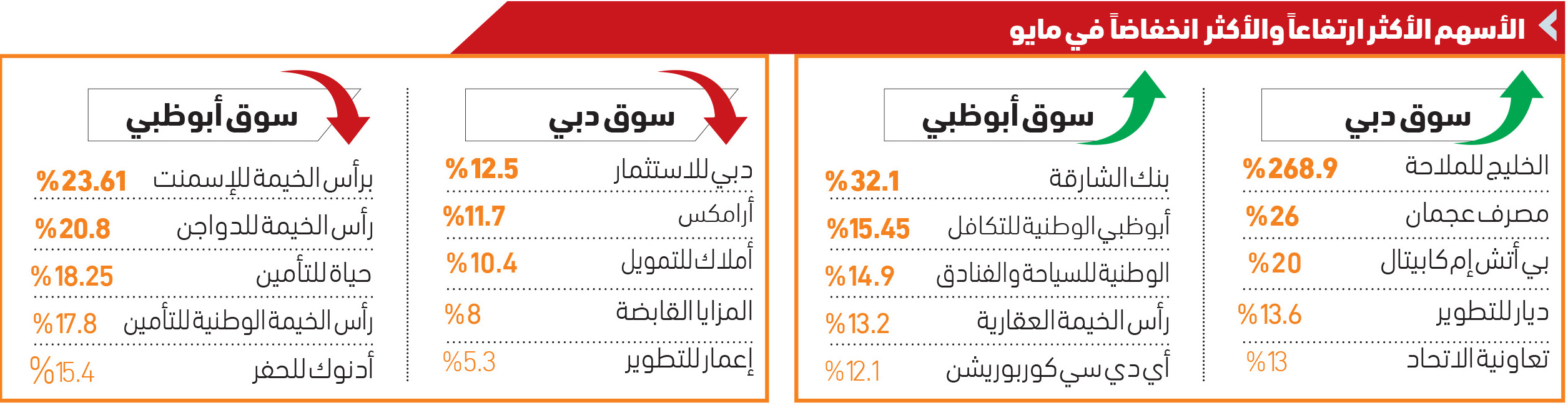 كانت مؤشرات أسواق الأسهم المحلية تباينت في شهر مايو الماضي، وسط سيولة قاربت 39.6 مليار درهم، مع تركزها بشكل رئيسي في أسهم المالية والعقار والطاقة والصناعة. وارتفع مؤشر سوق دبي 0.9 % عند مستوى 3576.63 نقطة بدعم أسهم العقار والبنوك، فيما انخفض مؤشر سوق أبوظبي 3.9 % إلى 9406.57 نقاط.