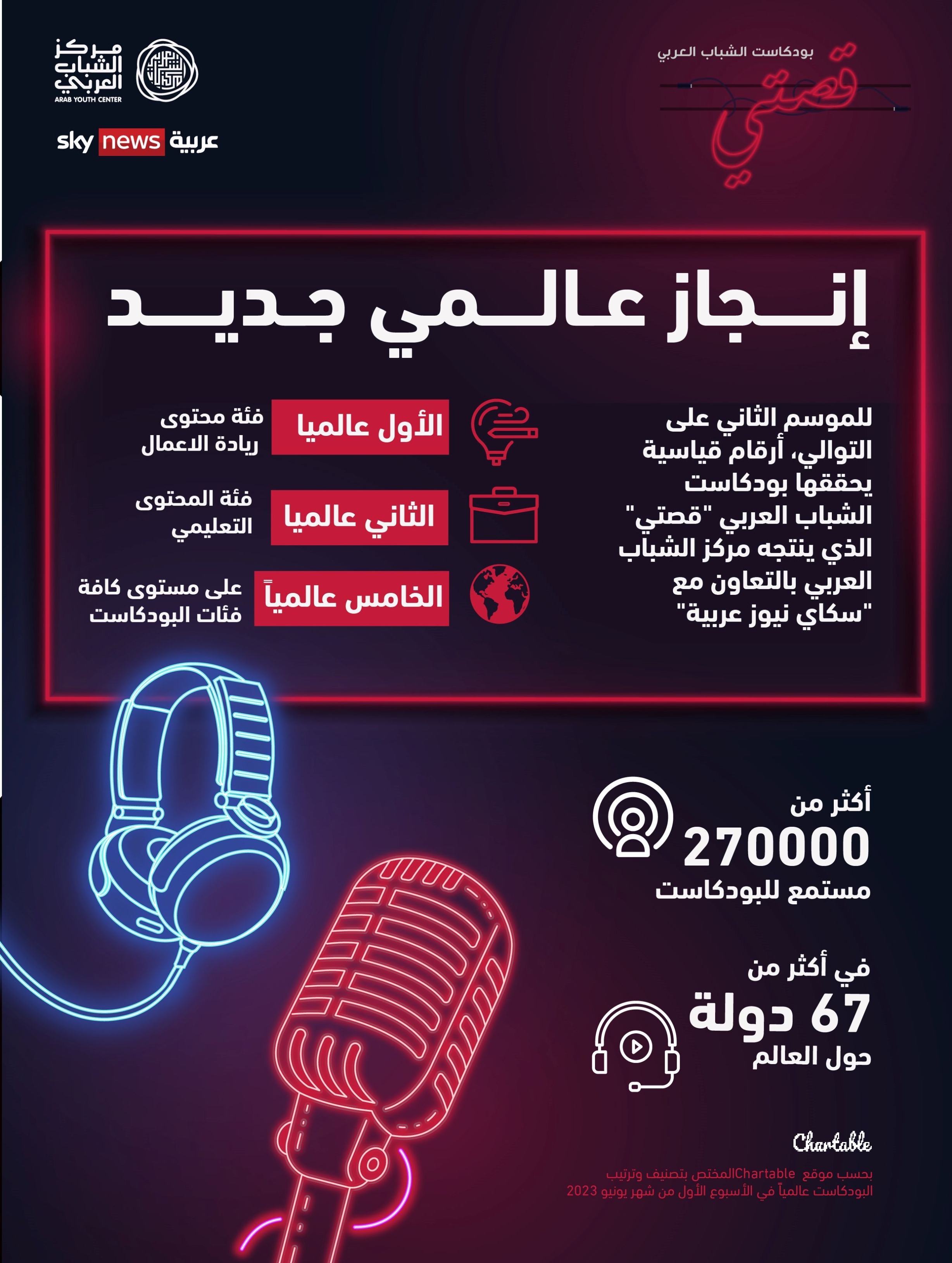 حقق مركز الشباب العربي للعام الثاني على التوالي إنجازاً عالمياً جديداً، بحلول بودكاست سلسلة "قصتي" الذي ينتجه المركز بالتعاون مع منصة سكاي نيوز عربية في أبوظبي في المرتبة الأولى عالمياً في فئة بودكاست الأعمال، والثانية عالمياً في فئة البودكاست التعليمي.