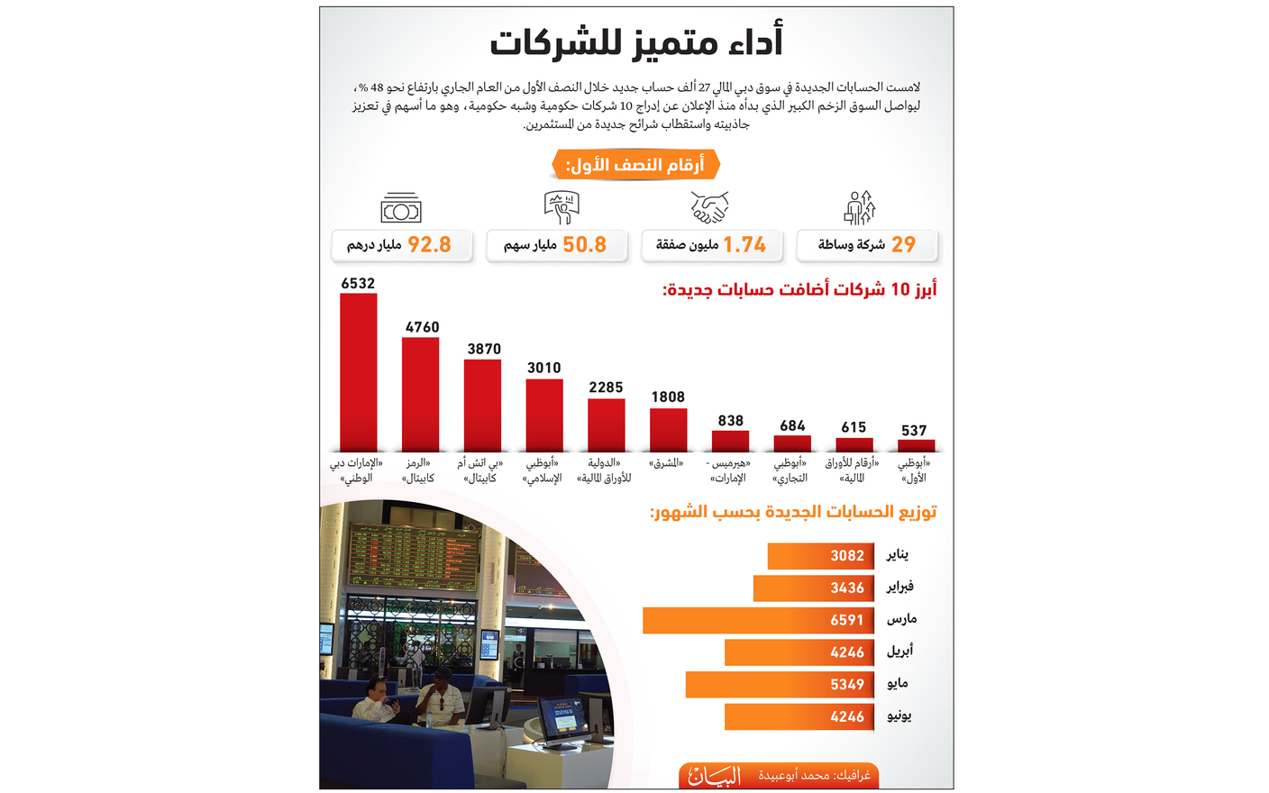أضافت شركات الوساطة في سوق دبي المالي 26 ألفاً و953 حساباً جديداً للمستثمرين خلال النصف الأول من العام الجاري، وسط زخم كبير يشهده السوق منذ الإعلان عن إدراج 10 شركات حكومية وشبه حكومية منها «ديوا» و«تيكوم» و«تعاونية الاتحاد» و«سالك» و«إمباور» و«تعليم» و«الأنصاري» للخدمات المالية وهو ما أسهم في تعزيز جاذبيته واستقطاب شرائح جديدة من المستثمرين.
