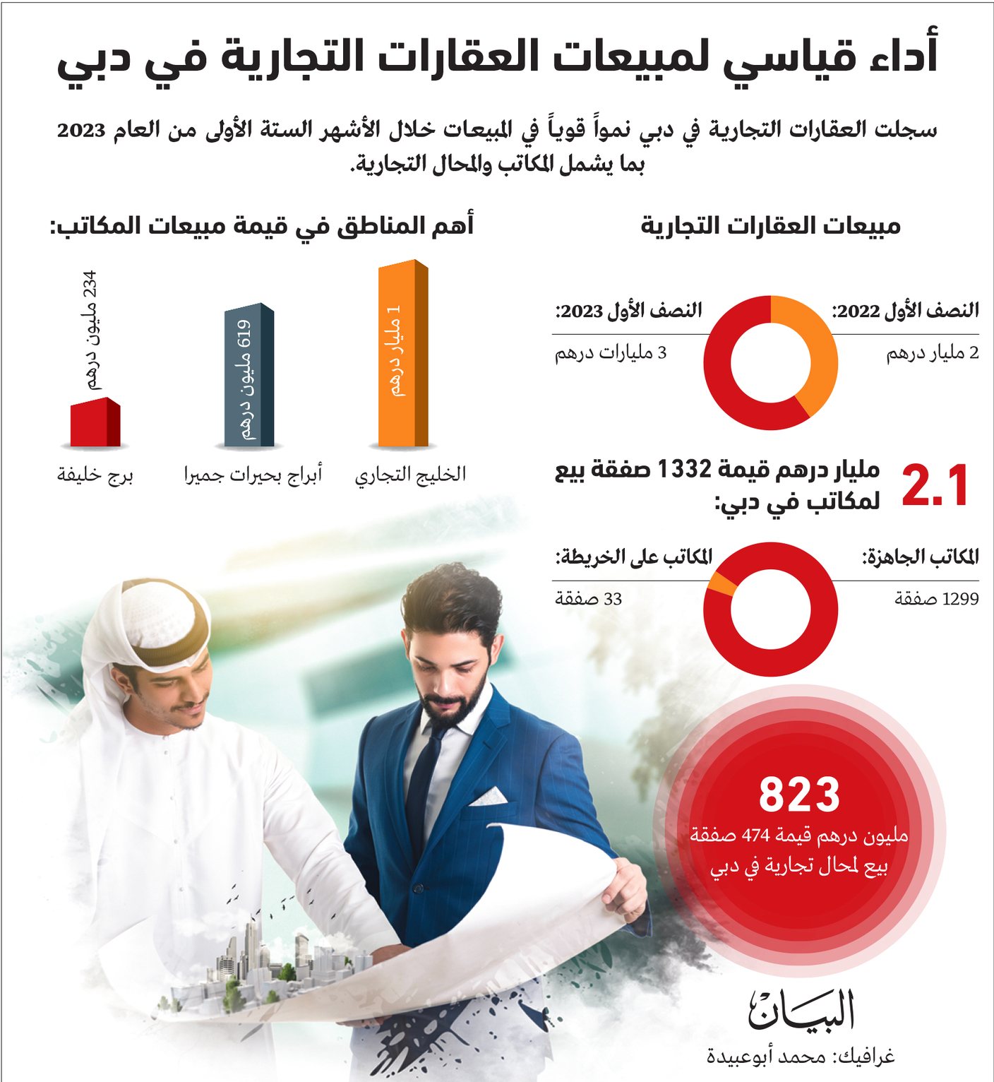 حققت مبيعات العقارات التجارية في دبي قفزة كبيرة خلال النصف الأول من العام الجاري، مسجلة 3 مليارات درهم، مقابل 2 مليار درهم في النصف الأول من عام 2022، وبنسبة نمو 50 %، ما يؤكد تنامي الجاذبية الاستثمارية للإمارة بالنسبة لرواد الأعمال والمستثمرين العالميين، والشركات متعددة الجنسيات، الأمر الذي أسهم في ارتفاع الطلب على المكاتب إلى هذه المستويات غير المسبوقة، وخاصة في مناطق الأعمال الرئيسة.