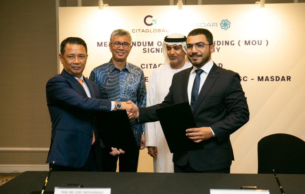 وخلال مراسم أقيمت في ماليزيا، بحضور تينكو زافرول، وزير الاستثمار والتجارة والصناعة في ماليزيا، وخالد غانم محمد الغيث، سفير الإمارات لدى ماليزيا، وقع مذكرة التفاهم كل من عبد الله زايد، رئيس قسم التطوير والاستثمار في «مصدر»، والدكتور محمد نورزا زكريا، رئيس مجلس إدارة «سيتاغلوبال»، وبموجب مذكرة التفاهم ستعمل «مصدر» و«سيتاغلوبال» على تطوير مشاريع في مجال الطاقة المتجددة في ولاية باهانج الماليزية، ويشمل ذلك استكشاف فرص تطوير مشاريع طاقة شمسية وطاقة رياح ونظم بطاريات تخزين الطاقة، وغيرها من تقنيات الطاقة المتجددة، وتستهدف ماليزيا تحقيق الحياد المناخي بحلول عام 2050.