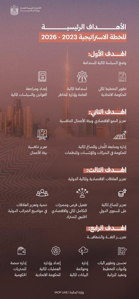 وزارة المالية تعلن عن الأهداف الرئيسية لخطتها الاستراتيجية 2023 – 2026 البيانأعلنت وزارة المالية عن الأهداف الرئيسية لخطتها الاستراتيجية 2023 – 2026، والتي تتضمن مهام دورية. وذلك تماشياً مع رؤية الإمارات وبالتواؤم مع التوجهات الوطنية والعالمية،