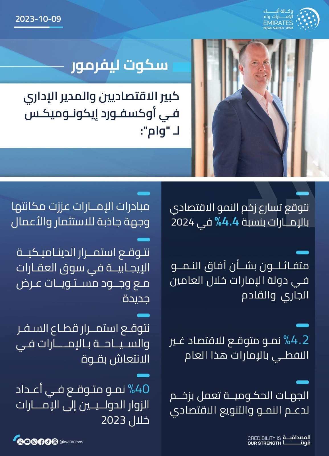 وقال سكوت ليفرمور، كبير الاقتصاديين والمدير الإداري في أوكسفورد إيكونوميكس، في تصريحات لوكالة أنباء الإمارات «وام»: «نحن متفائلون بشأن آفاق النمو في دولة الإمارات، حيث تعمل الجهات الحكومية بزخم لدعم النمو والتنويع الاقتصادي في الدولة من خلال الدعم المباشر والمبادرات التي تجعل الإمارات وجهة أكثر جاذبية للاستثمار والأعمال».