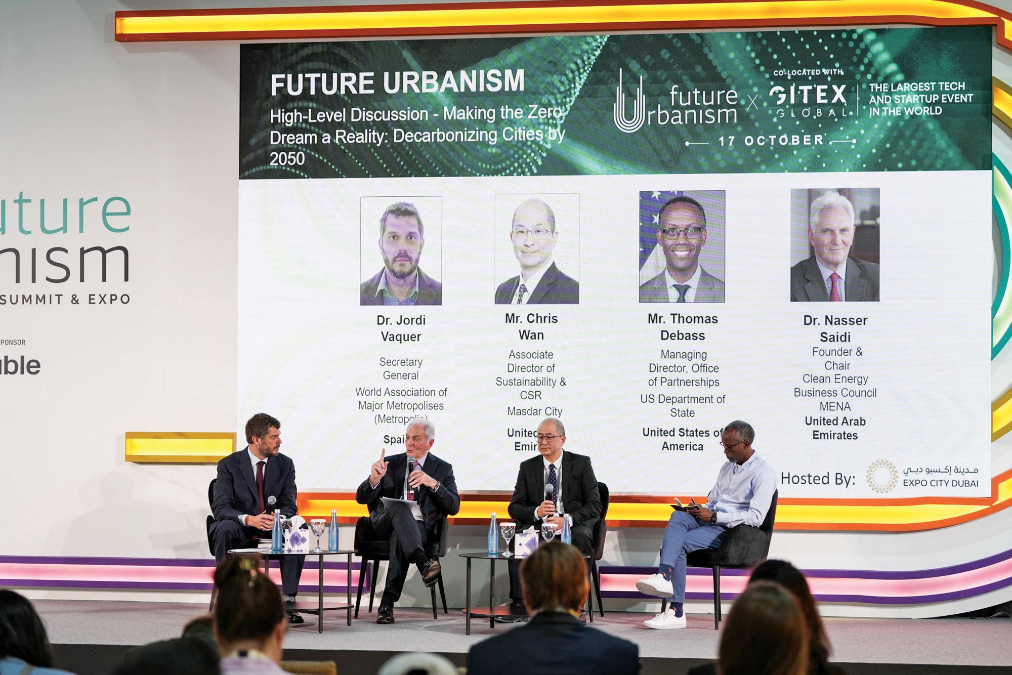 وكان هناك جلسة حوارية رفيعة المستوى حول مستقبل المدن الذكية تناولت موضوع «تحويل حلم الحياد الكربوني إلى حقيقة: إزالة الكربون من المدن بحلول عام 2050». وشارك في الجلسة كل من كريس وان، المدير المساعد للاستدامة والمسؤولية الاجتماعية للشركات في مدينة مصدر؛ وجوردي فاكير، الأمين العام للرابطة العالمية للمدن الكبرى؛ والدكتور ناصر السعيدي، رئيس مجلس صناعات الطاقة النظيفة بمنطقة الشرق الأوسط وشمال أفريقيا؛ وتوماس ديباس، العضو المنتدب ورئيس قسم الشراكات في وزارة الخارجية الأمريكية.