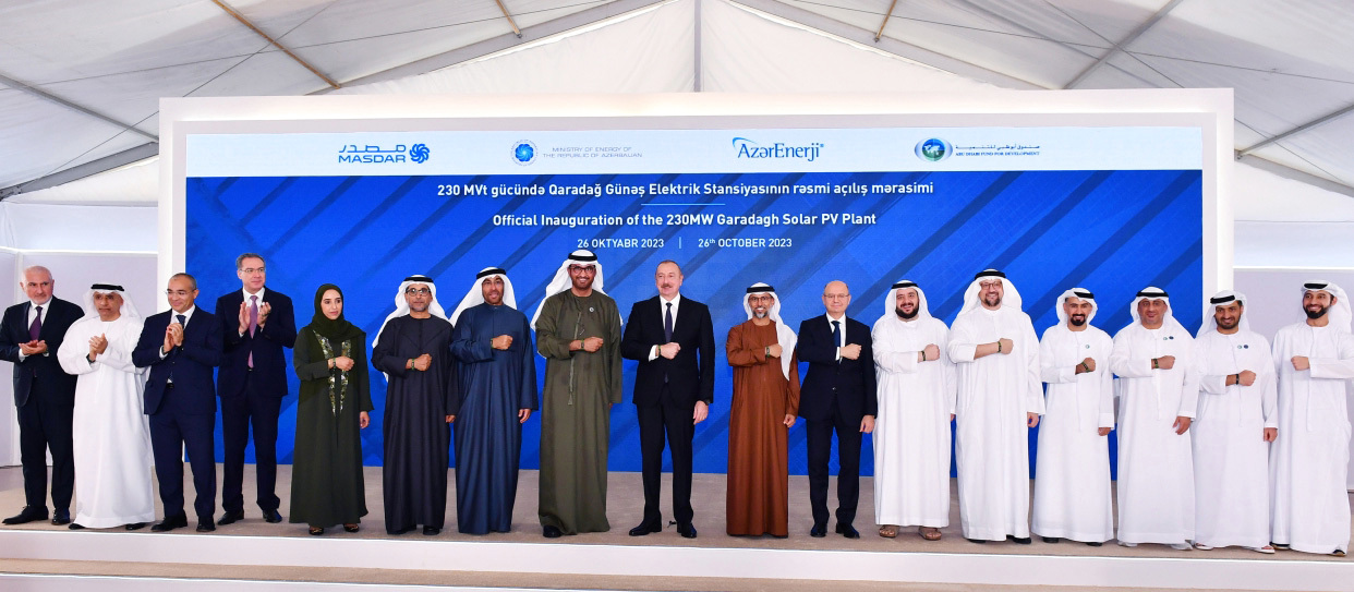 بحضور إلهام علييف، رئيس جمهورية أذربيجان، ومعالي الدكتور سلطان بن أحمد الجابر، وزير الصناعة والتكنولوجيا المتقدمة، رئيس مؤتمر الأطراف COP28، رئيس مجلس إدارة «مصدر»، تم تدشين محطة كاراداغ للطاقة الشمسية التي طورتها شركة أبوظبي لطاقة المستقبل «مصدر» الرائدة عالمياً في مجال الطاقة النظيفة في أذربيجان بقدرة 230 ميجاواط، التي تعتبر أكبر محطة من نوعها قيد التشغيل على مستوى المنطقة، وأول مشروع طاقة شمسية مستقل قائم على الاستثمار الأجنبي في أذربيجان.