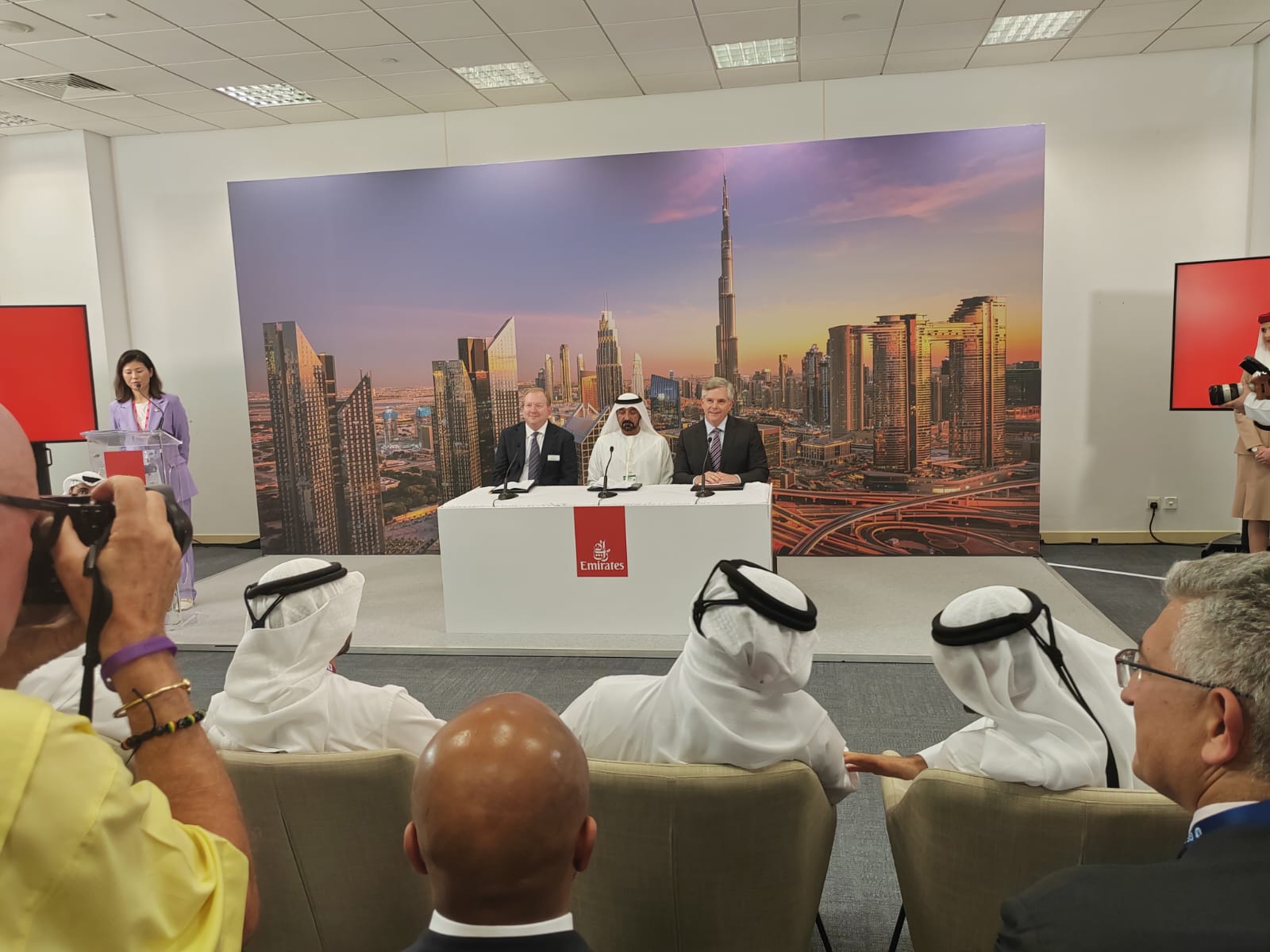 وبحضور سمو الشيخ حمدان بن محمد بن راشد آل مكتوم، ولي عهد دبي رئيس المجلس التنفيذي لإمارة دبي، و سمو الشيخ مكتوم بن محمد بن راشد آل مكتوم، النائب الأول لحاكم دبي نائب رئيس مجلس الوزراء وزير المالية، وسمو الشيخ منصور بن محمد بن راشد آل مكتوم رئيس مجلس دبي الرياضي، وقع طلبيات الطائرات سمو الشيخ أحمد بن سعيد آل مكتوم، الرئيس الأعلى الرئيس التنفيذي لطيران الإمارات والمجموعة، مع ستان ديل، الرئيس والمدير التنفيذي لشركة بوينج للطائرات التجارية، ولاري كولب الرئيس التنفيذي لجنرال الكتريك والرئيس التنفيذي لـ"جي ئي إيروسبيس".