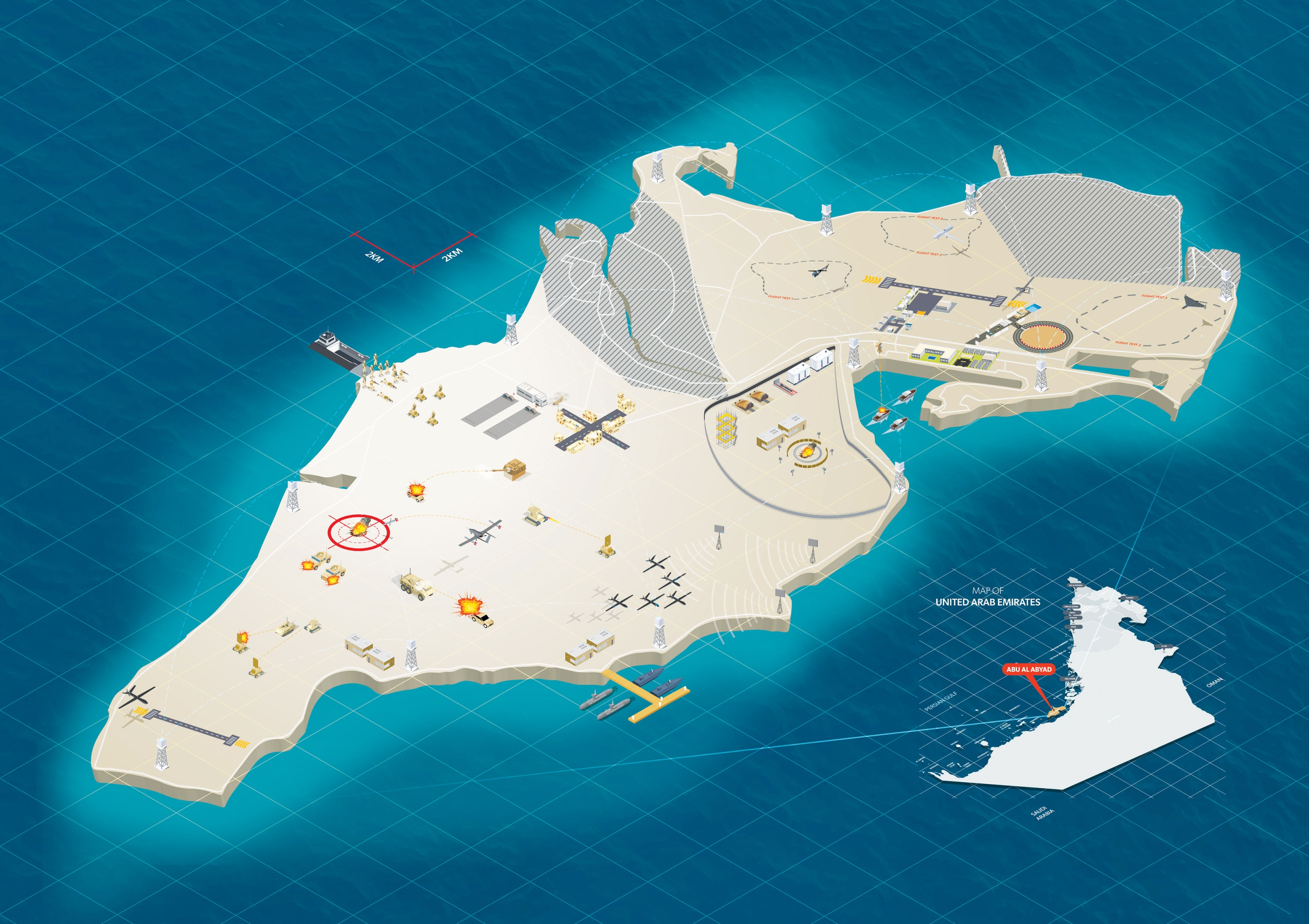 ويقع الميدان على جزيرة مشددة الأمان تبلغ مساحتها 350 كيلومتراً مربعاً، ويتضمن مدرجاً بطول 3,800 متر للطائرات كبيرة الحجم، ومدرجاً بطول 1,200 متر للطائرات المسيّرة ضمن منطقة حظر جوي مغلقة دائماً حتى ارتفاع 10 آلاف قدم، مع إمكانية توسعة ذلك إلى ارتفاعات أعلى بكثير.. كما جرى تجهيز الجزيرة بقرية تدريب حضرية تفصيلية لمحاكاة العمليات الخاصة، وشبكة اتصالات رقمية توفر تغطية آمنة للجزيرة، وخط ساحلي مخصص للتدريبات البحرية والتمرين على عمليات الإنزال.