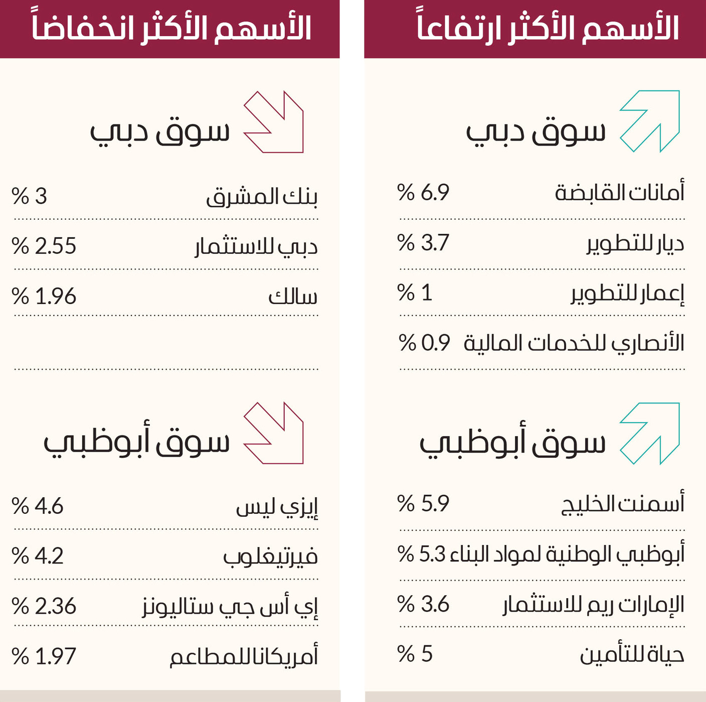 وقاد سهم «أمانات القابضة» ارتفاعات 12 سهماً بسوق دبي، وارتفع بـ6.9%، وصعدت في سوق دبي أسهم «ديار للتطوير» 3.7%، و«إعمار للتطوير» 1%، و«الأنصاري للخدمات المالية» 0.9%، و«الإمارات دبي الوطني» 0.57%، و«دبي الإسلامي» 0.18%.