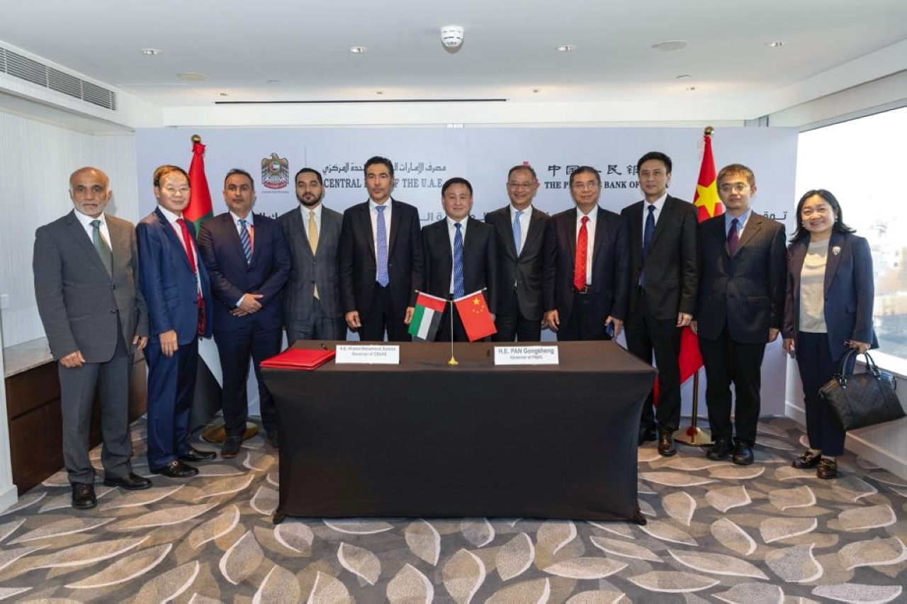 وقّع الاتفاقية ومذكرة التفاهم في هونغ كونغ، خالد محمد بالعمى، محافظ مصرف الإمارات المركزي، وبان جونغ شينغ، محافظ بنك الصين الشعبي، وبحضور الشيخ سعود علي المعلا القنصل العام لدولة الإمارات في هونغ كونغ.