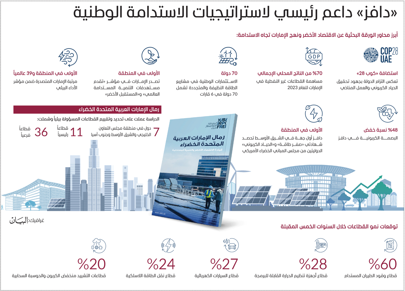 أشارت الورقة البحثية التي أصدرتها «دافز» إلى أن مساهمة القطاعات غير النفطية في الناتج المحلي الإجمالي بلغت 70% في عام 2023، ويأتي ذلك بفضل توجيهات القيادة الرشيدة في تعزيز التحول العالمي نحو الاقتصاد الأخضر المستدام، والاستثمارات الوطنية الكبرى في مشاريع الطاقة النظيفة والمتجددة والتي تشمل 70 دولة في 6 قارات. ومقارنة بباقي دول مجلس التعاون الخليجي ومنطقة الشرق الأوسط وشمال أفريقيا، أظهرت الورقة البحثية أن دولة الإمارات تمضي بخطى متقدمة وثابتة في رحلة الطاقة المتجددة، حيث وضعت دولة الإمارات العربية المتحدة أهدافاً واقعية وقابلة للتحقيق تبعاً لمختلف المقاييس العالمية. إذ تصدرت الإمارات دول مناطق مجلس التعاون الخليجي والشرق الأوسط وشمال أفريقيا وجنوب آسيا ضمن مؤشري «تقدم مستهدفات التنمية المستدامة العالمي» و«المستقبل الأخضر»، إلى جانب تصدرها لمؤشر الأداء البيئي في المنطقة وبترتيب قدره 39 عالمياً.