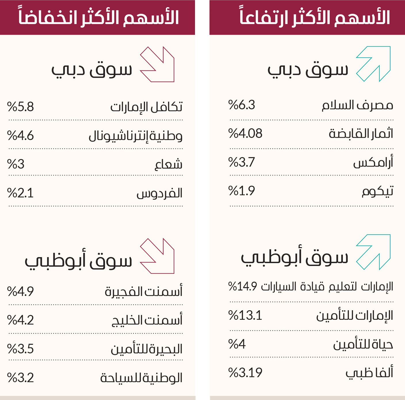 فيما كان سهم «الإمارات لتعليم قيادة السيارات» في صدارة ارتفاعات سوق أبوظبي بنمو 14.9% ثم سهم «الإمارات للتأمين» بنسبة نمو بلغت 13.1% ثم سهم «حياة للتأمين» بنسبة 4%، بينما ارتفع «ألفا ظبي» 3.19%. وبشأن الانخفاضات تراجع سهم «أسمنت الفجيرة» بنسبة 4.9%، تلاه سهم «أسمنت الخليج» بنسبة 4.2% ثم كل من سهم «البحيرة للتأمين» بنسبة 3.5% وسهم «الوطنية للسياحة» بنسبة 3.2%.