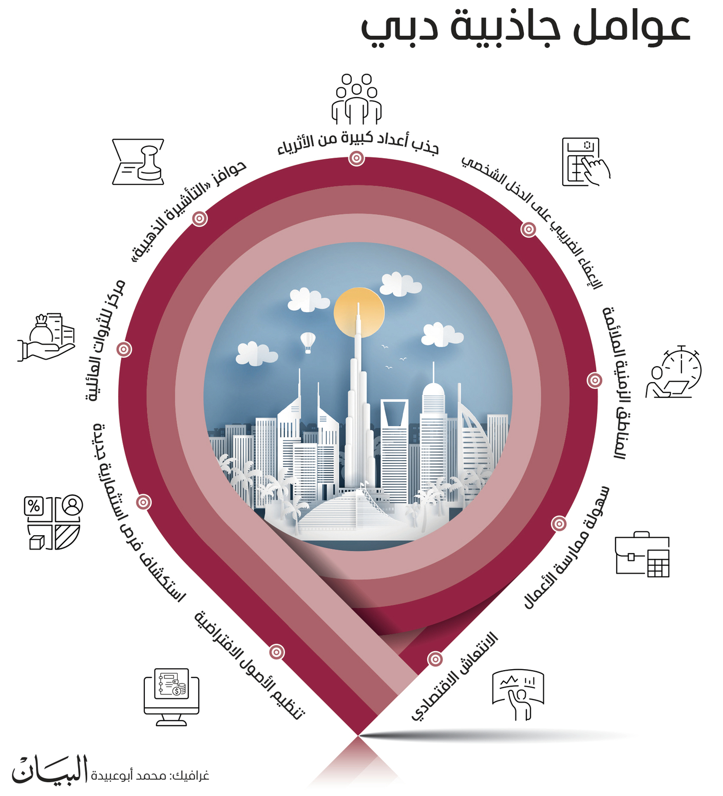 وأسهم الانتعاش الاقتصادي بعد جائحة «كوفيد 19»، وسهولة ممارسة الأعمال التجارية، والمناطق الزمنية الملائمة، والإعفاء من الضرائب على الدخل الشخصي، في جذب أعداداً كبيرة من الأثرياء في السنوات الأخيرة. وقدمت الإمارات في الآونة الأخيرة حوافز مثل نظام «التأشيرة الذهبية». وأطلقت دبي «مركزاً للثروات العائلية» العام الماضي لمساعدة الأفراد والشركات الأثرياء على التعامل مع الأمور الثقافية والحوكمة.