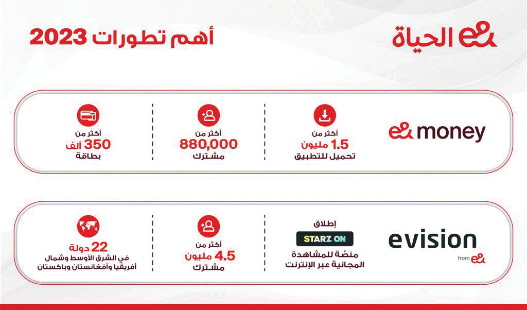 أصبحت «إي آند الحياة» من أهم المحركات الأساسية لـ«إي آند»، التي تعرف اليوم بصفتها مجموعة رائدة عالميّاً في التكنولوجيا والاستثمار، وقدّمنا للمستخدمين منصّة للمشاهدة المجانية عبر الإنترنت «STARZ ON»، والتي تقدّم المحتوى الإقليمي ومحتوى هوليوود وبوليوود، والمحتوى المتنوع بالعربية والإنجليزية والفرنسية، إلى جانب المحتوى الرياضي، وذلك بشكل مجاني للمشاهدين، وفي قطاع التكنولوجيا المالية، أصبحت المنصة المالية e& money أول منصة مالية ضمن قطاع الاتصالات تصدر بطاقات بالتعاون مع ماستر كارد في دولة الإمارات، وبذلك وفّرت المزيد من خيارات الدفع والسرعة والأمان في البطاقات الائتمانية.