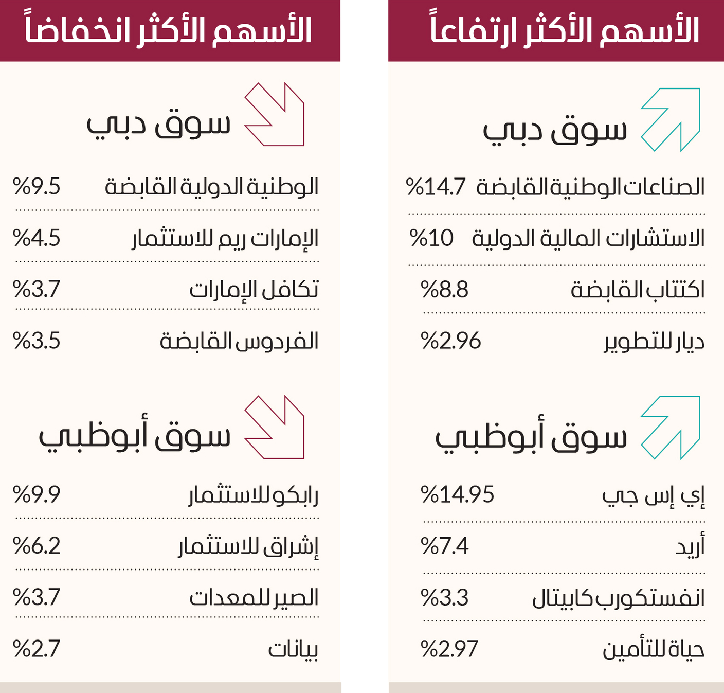 وتدعم أداء سوق دبي المالي بارتفاع أسهم الاستشارات المالية الدولية 10%، واكتتاب القابضة 8.8%، وديار للتطوير 2.96%، وأمانات القابضة 2.7%، والمشرق 2.26%، وإعمار للتطوير 0.84%.