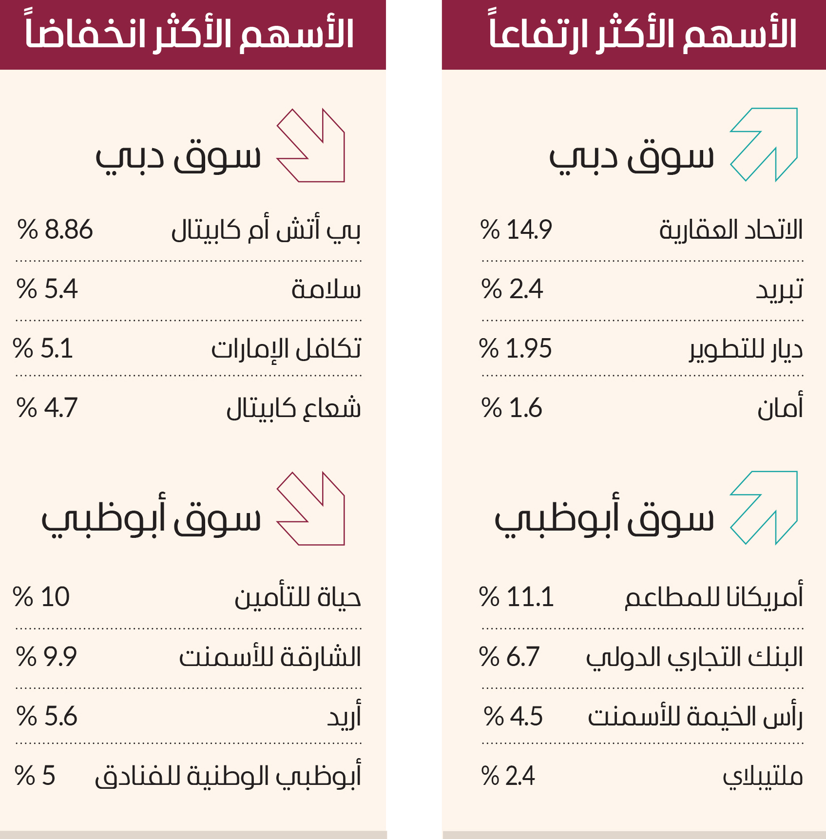 وارتفع في سوق أبوظبي أسهم «أمريكانا للمطاعم» 11.1%، و«البنك التجاري الدولي» 6.7%، و«رأس الخيمة للأسمنت» 4.5%، و«ملتيبلاي» 2.4%.