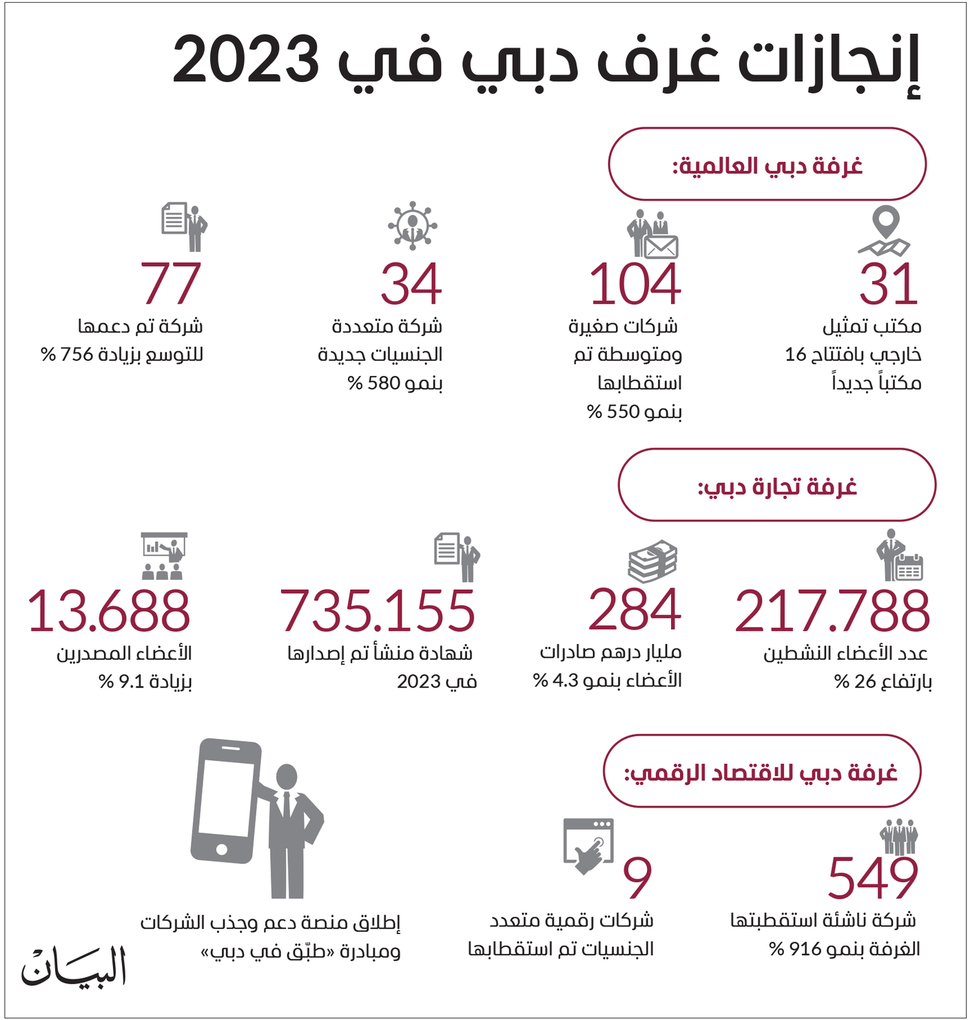 وخلال اللقاء الإعلامي السنوي، كشفت غرف دبي عن انضمام 67.222 شركة جديدة إلى عضوية غرفة تجارة دبي خلال العام الماضي، بنسبة نمو سنوية بلغت 20%، وهي أعلى نسبة للأعضاء الجدد في تاريخ الغرفة، في حين بلغ إجمالي عدد الأعضاء النشطين في عضوية الغرفة 217.788 شركة، بنسبة نمو سنوية بلغت 26.8%. وبلغت قيمة صادرات وإعادة صادرات أعضاء الغرفة 284.5 مليار درهم، بنسبة نمو سنوية بلغت 4.3%. ونجحت غرفة دبي العالمية، في استقطاب 138 شركة متنوعة، منها 34 شركة متعددة الجنسيات، بنسبة نمو سنوية بلغت 580%، و104 شركات صغيرة ومتوسطة، بنسبة نمو سنوية بلغت 550%. وبلغ عدد شركات دبي التي دعمت الغرفة توسعها الخارجي 77 شركة، بنسبة نمو قياسية بلغت 756%، في حين ارتفع إجمالي عدد المكاتب الخارجية التي تديرها الغرفة إلى 31 مكتباً مع افتتاح 16 مكتباً خارجياً جديداً خلال العام 2023 لوحده.