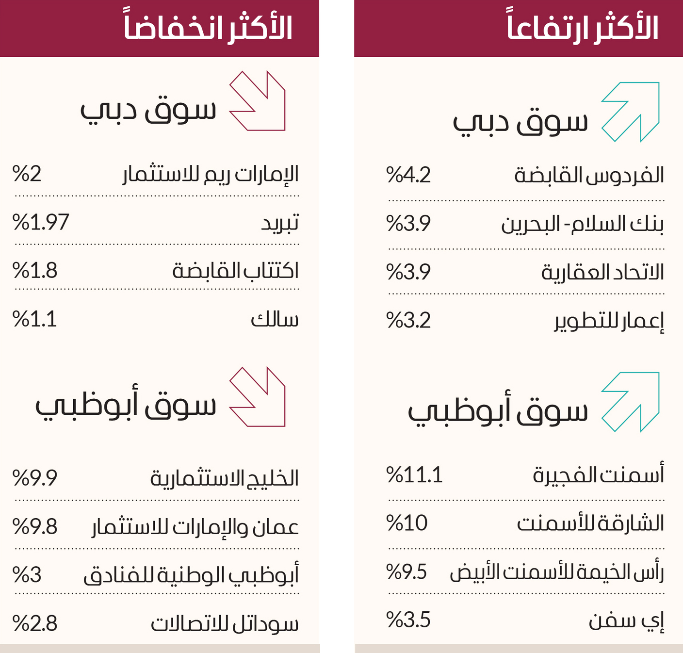 وارتفع في سوق أبوظبي أسهم «أسمنت الفجيرة 11.1%، و«الشارقة للأسمنت» 10%، و«رأس الخيمة للأسمنت اﻷبيض» 9.5%، و«إي سفن» 3.5%.