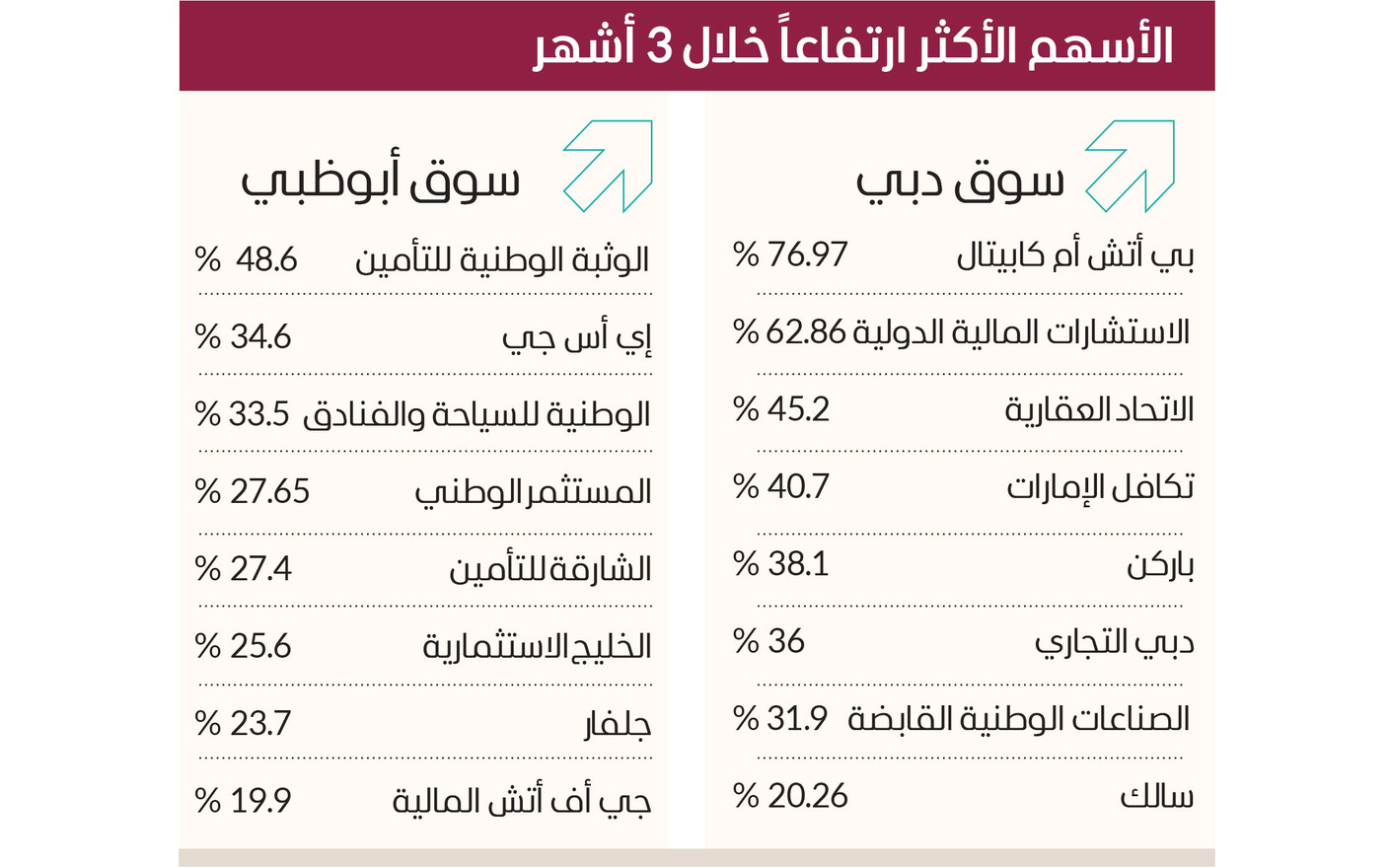 وفي سوق أبوظبي، صعدت أسهم الوثبة الوطنية للتأمين 48.6%، وإي أس جي 34.6%، والوطنية للسياحة والفنادق 33.5%، والمستثمر الوطني 27.65%، والشارقة للتأمين 27.4%، وزاد الخليج اﻻستثمارية 25.6%، وجلفار 23.7%، وجي أف أتش المالية 19.9% خلال 3 أشهر.